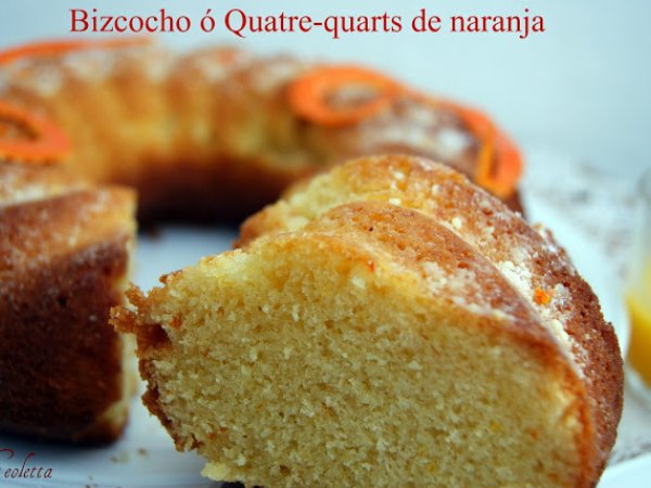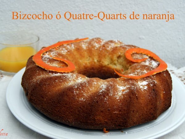 Bizcocho ó quatre-quarts de naranja AnteriorSiguiente AperitivoFácil1 h 5 m1045 Kcal Enviar esta receta a un amigo Imprimir esta página Preguntar al autor Publicar la foto de esta receta Ingredientes 4 250 g de azúcar 250 g de harina 250 g de mantequilla 4 huevos medianos un sobre de levadura química ralladura de dos naranjas el zumo de una naranja una pizca de sal Costo estimado: 3.76Euros€ (0.94€/porción)