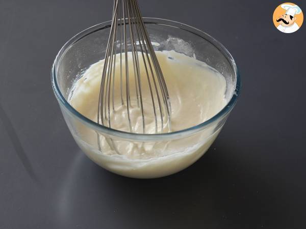 Verter el yogur griego en un bol y añadir el huevo, mezclar bien. Seguidamente, añadir la harina, la levadura en polvo y una pizca de sal.