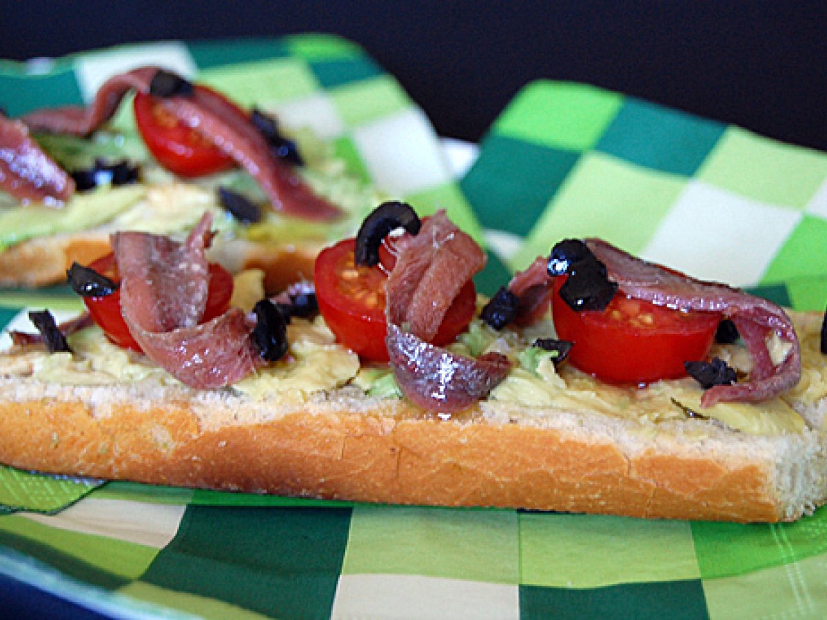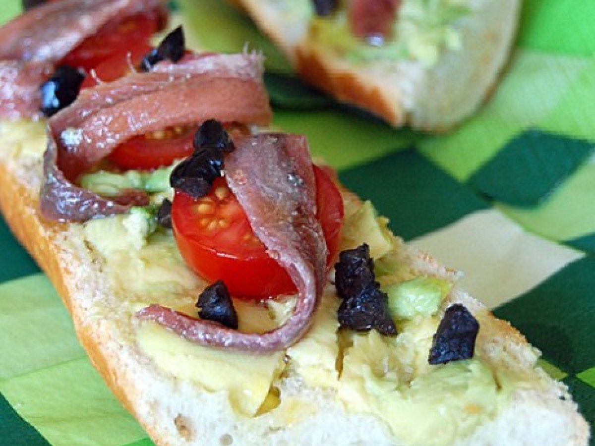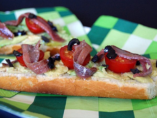 Bocadillo de aguacate con anchoas vota ahora AnteriorSiguiente AperitivoFácil10 min Enviar esta receta a un amigo Imprimir esta página Preguntar al autor Publicar la foto de esta receta Ingredientes 4 1 lata de Anchoas del Cantábrico de Conservas Serrats 1 aguacate 3 tomates cherry 5 o 6 aceitunas negras sin hueso 1 baguette o flauta