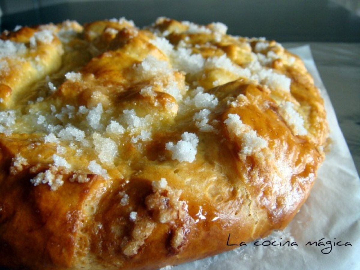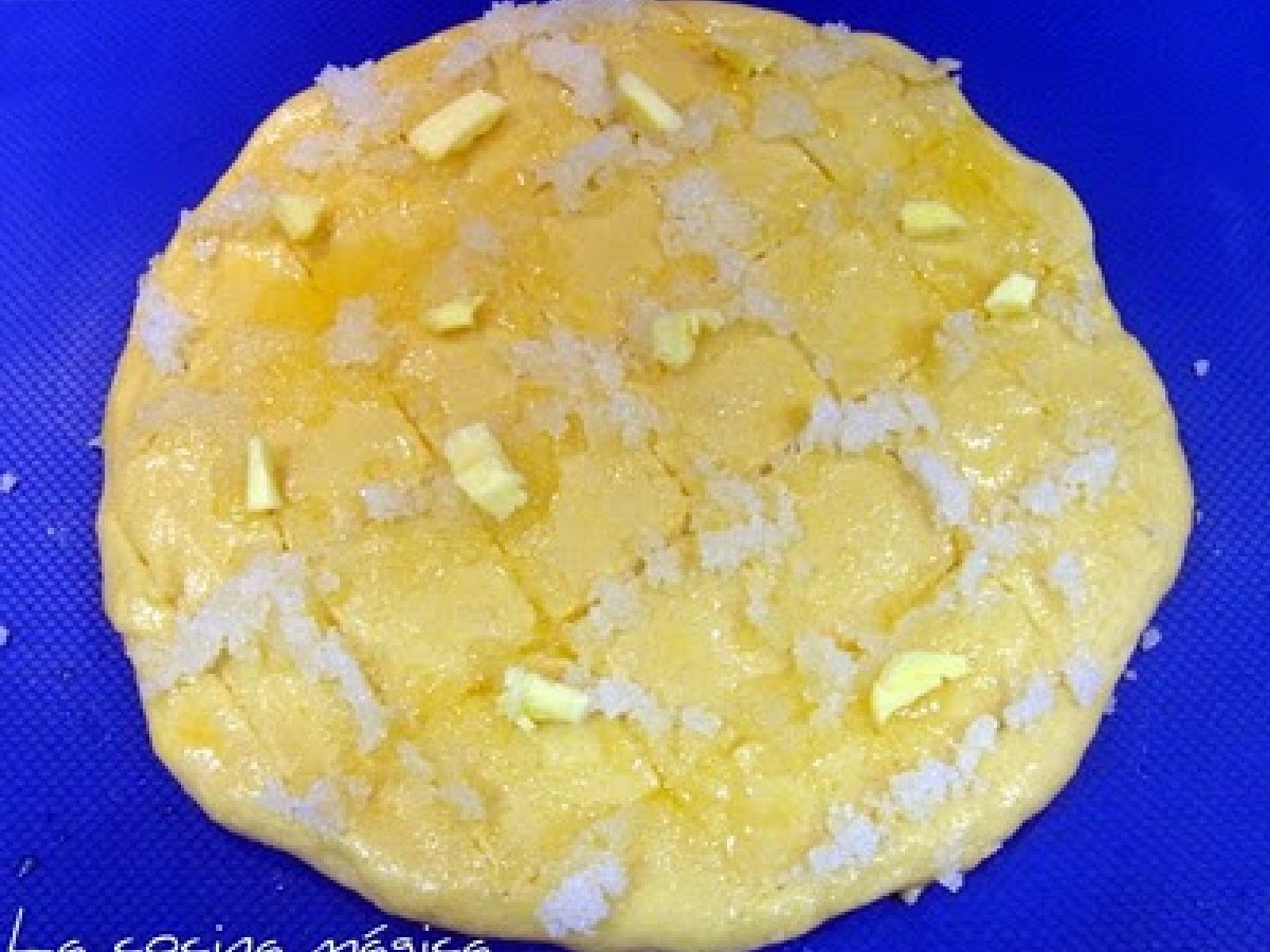 - Darle una forma redonda y aplastada. Preparar una bandeja de horno con un papel de hornear. Batir un huevo y pintar con ella la bolla. Con un cuchillo hacerle unos cortes formando cuadrados. En un bol pequeño poner azúcar normal con unas gotas de agua .Espolvorear la larpeira con esta azúcar y poner unos daditos de mantequilla por la superficie.
