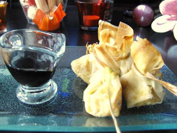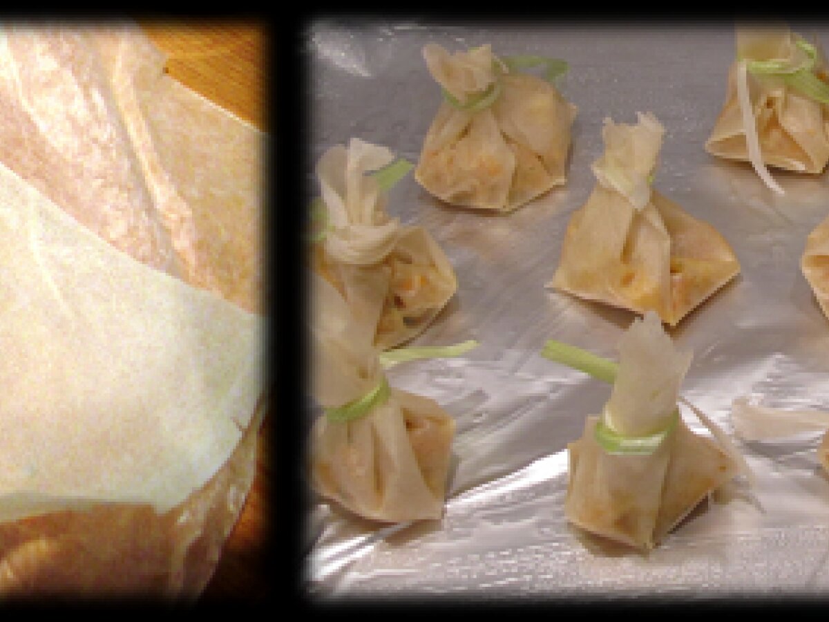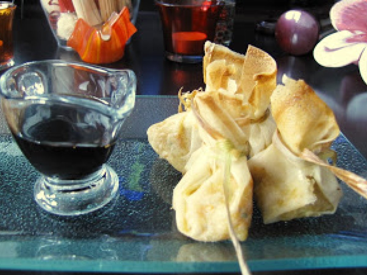 - Luego con una cucharilla pequeña forme unas bolitas de masa y luego colóquelas en el centro de cada porción de masa brick. Ciérrelas formando una bolsa que envuelva todo el relleno y átelas con listones de puerro picado, cortando los excesos de puerro luego de atarlas. Póngalas sobre papel de horno y llévelas al mismo por 15 minutos a 175 grados centígrados. Esta receta se puede utilizar para hacer las bolsitas horneadas, más sanas porque se cocinaran sin aceite, ó si prefiere tenerlas listas con mayor rapidez puede freírlas. Servir y disfrutar!!! Puede acompañarlas de salsa de soja, como se muestra en la foto.