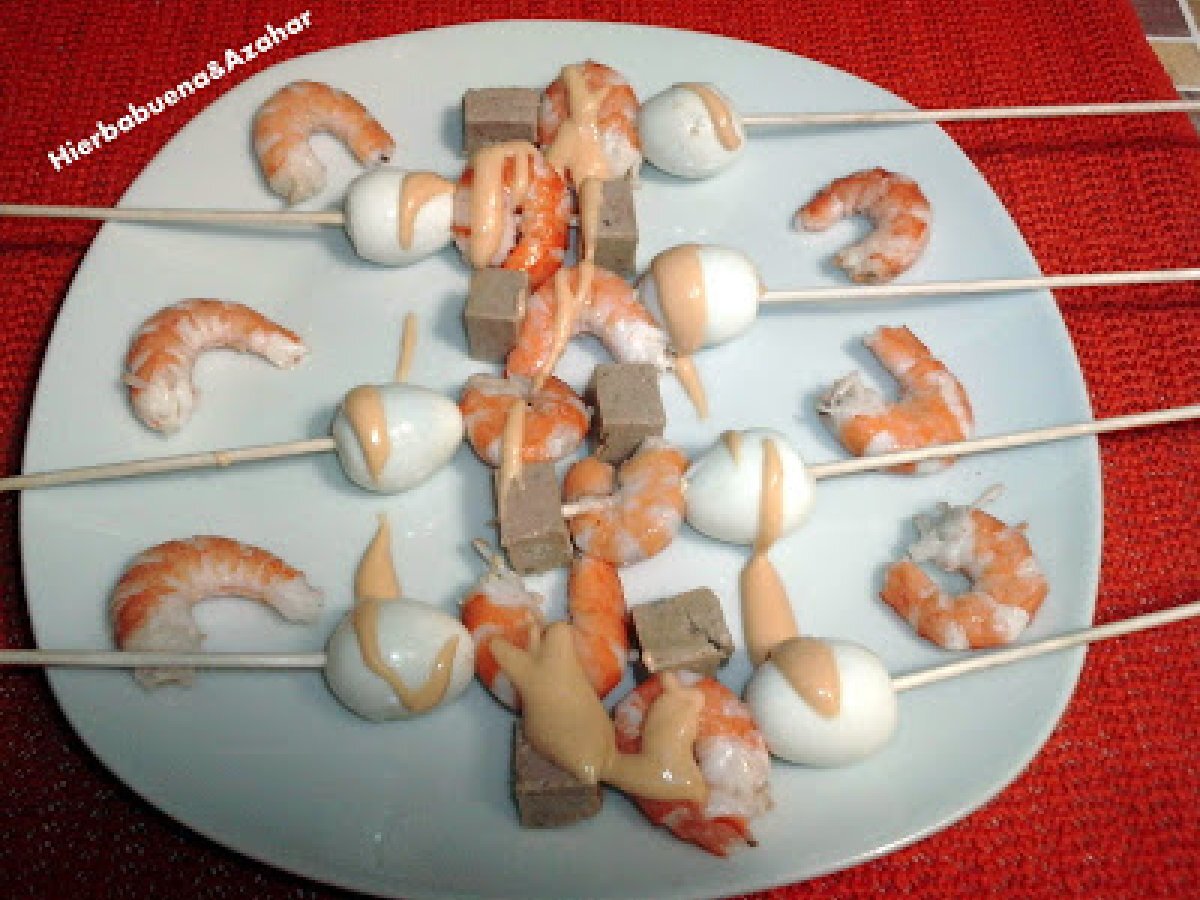 Brochetas especiales con salsa rosa AnteriorSiguiente AperitivoFácil22 min1275 Kcal Enviar esta receta a un amigo Imprimir esta página Preguntar al autor Publicar la foto de esta receta Ingredientes 2 12 huevos de codorniz 12 langostinos o gambas cocidas 12 tacos de atún 3 cucharadas de mahonesa 1 cucharada de tomate frito 1 pelín de whisky