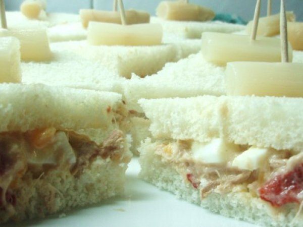 Canapè de tonyina / canapé de atún AperitivoFácil10 min204 Kcal Enviar esta receta a un amigo Imprimir esta página Preguntar al autor Publicar la foto de esta receta Ingredientes 2 Pan de molde Atún Olivas Pimiento del piquillo Huevos duros Espárragos Mayonesa