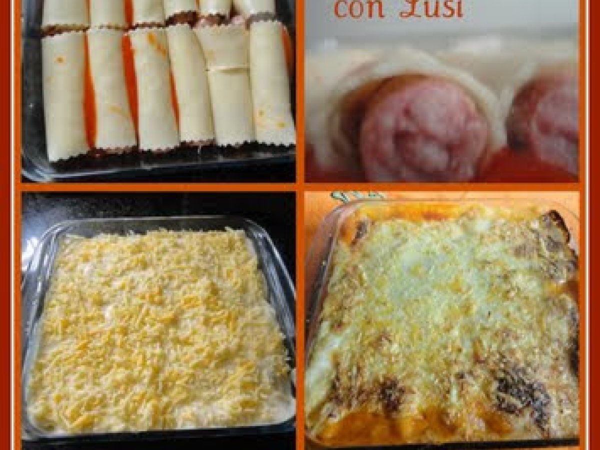 Canelones de salchichas AnteriorSiguiente AperitivoFácil30 min2453 Kcal Enviar esta receta a un amigo Imprimir esta página Preguntar al autor Publicar la foto de esta receta Ingredientes 2 10 Salchichas frescas 10 Placas para canelones 10 lonchas de queso Tomate frito Bechamel Queso rallado para gratinar