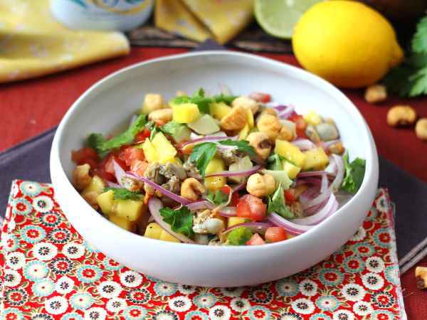Ceviche de vieiras con crema fraiche, pimiento morrón y eneldo