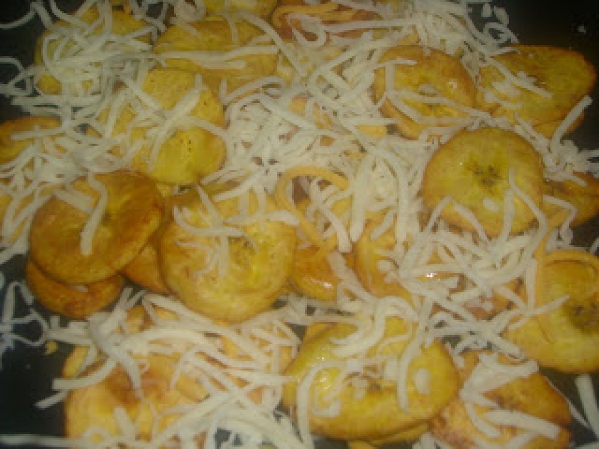 - Cortar en radijitas finas el plátano.Freír con abundante aceite caliente hasta que estén doraditas.