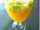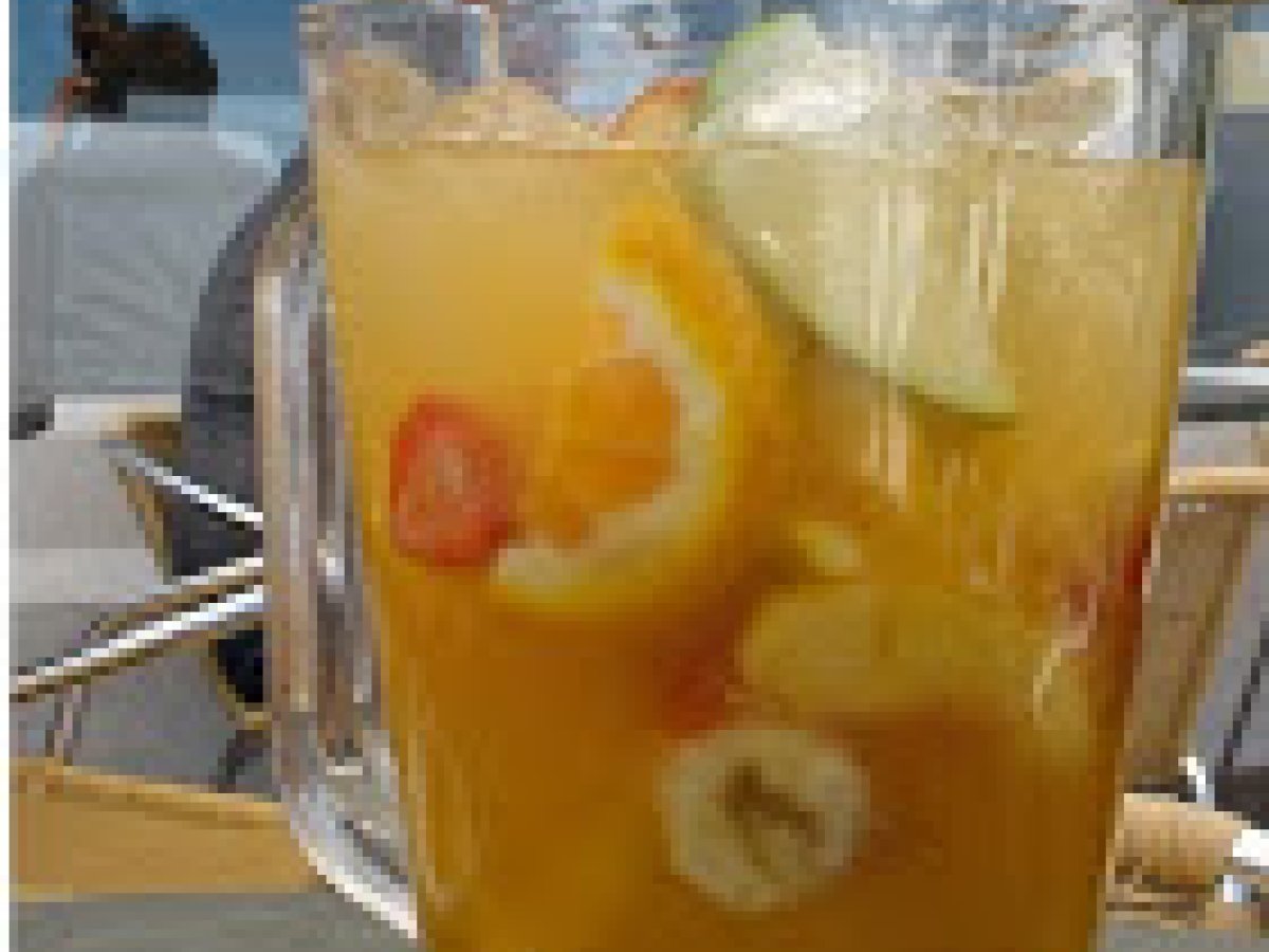 - Colocamos en la jarra, el azúcar y las frutas bien lavadas y cortadas en trozos, agregamos el azúcar, el almíbar y el champagne; presionamos un poco las frutas con la cuchara de madera mientras revolvemos, para permitir que la fruta desprenda un poco de su jugo.