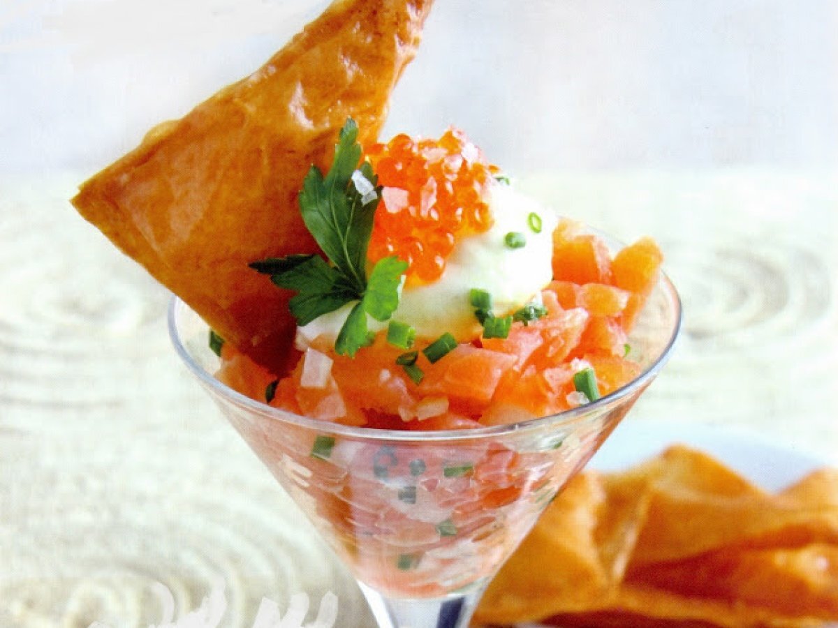 Cóctel de salmón y espuma de mostaza AperitivoFácil50 min Enviar esta receta a un amigo Imprimir esta página Preguntar al autor Publicar la foto de esta receta Ingredientes 2 300 gr de salmón ahumado 2 cucharadas de huevas de salmón 2 cebolletas 2 hojas de pasta filo 1 cucharada de mostaza de Dijon 1 vaso de crema de leche 2 cucharadas de mantequilla ligera vinagre de sidra aceite de oliva cebollino mostaza en semillas hierbas provenzales perifollo sal pimienta