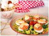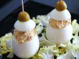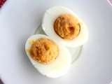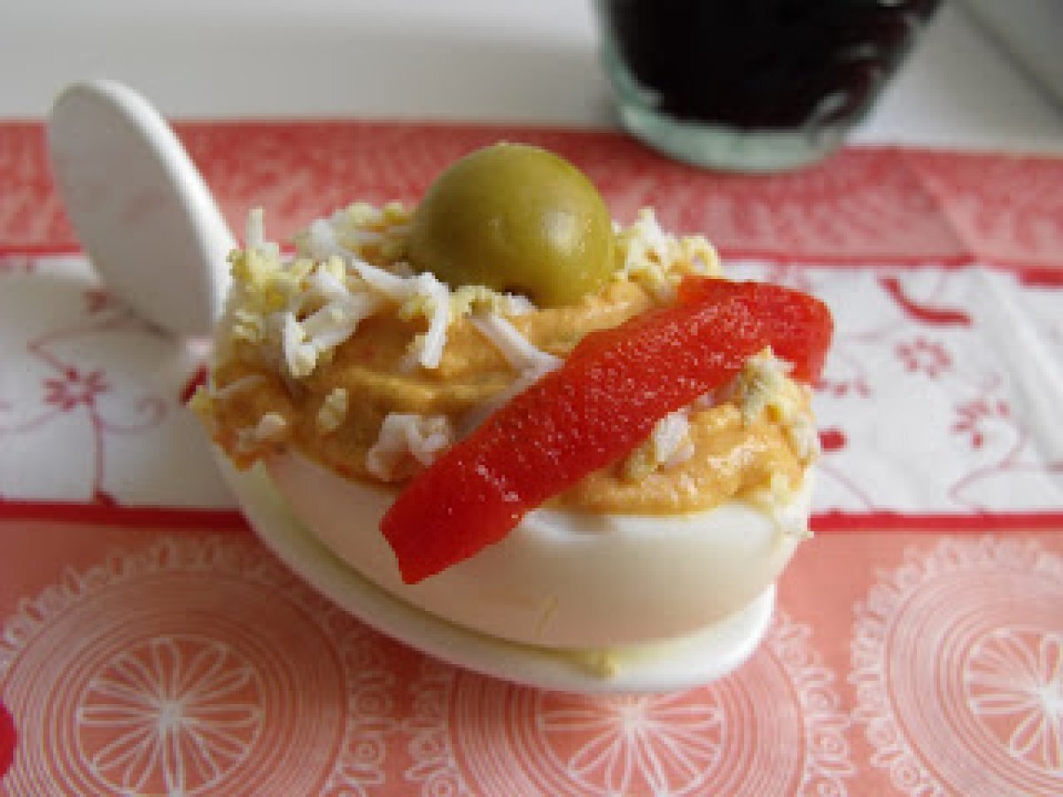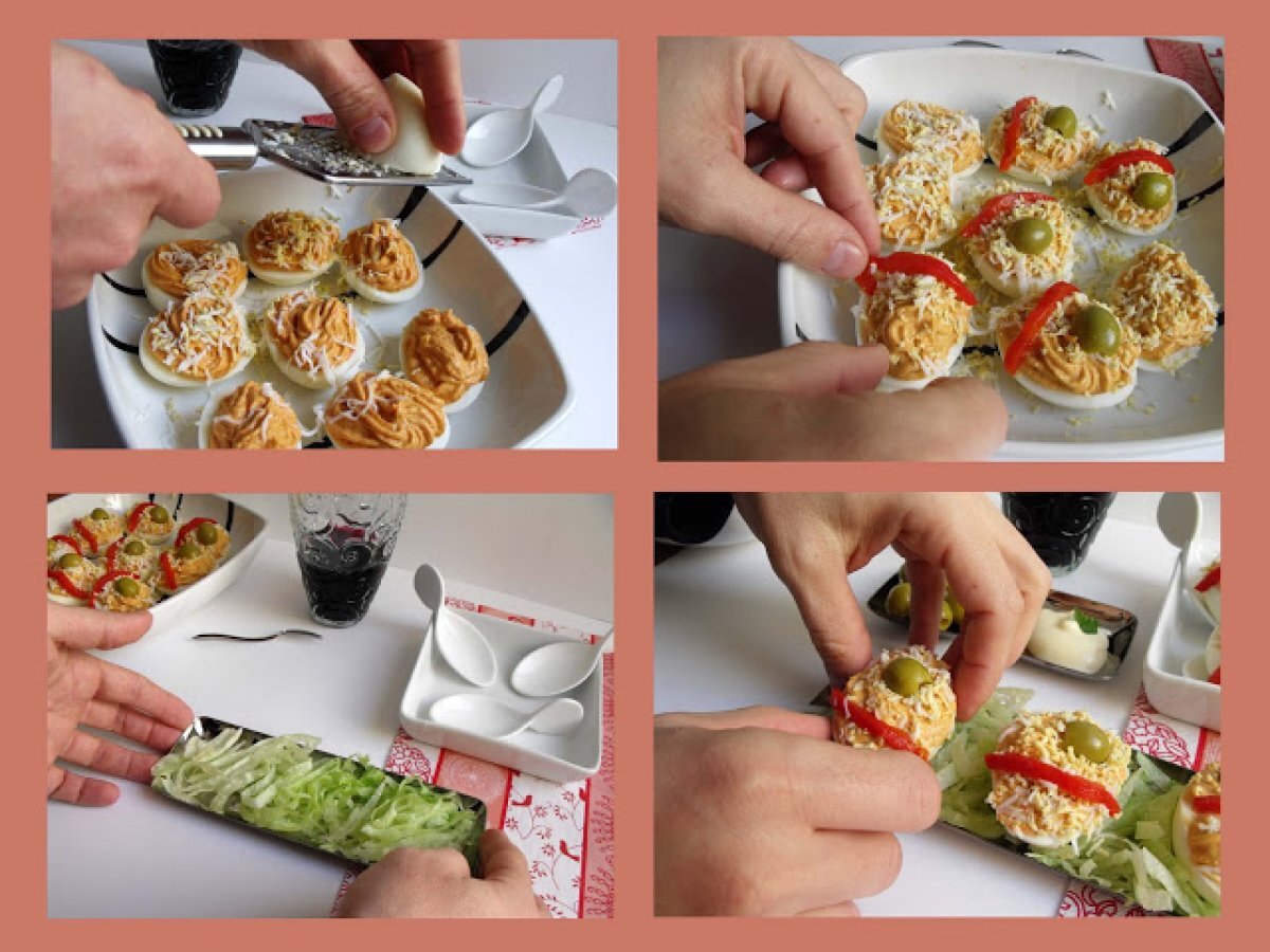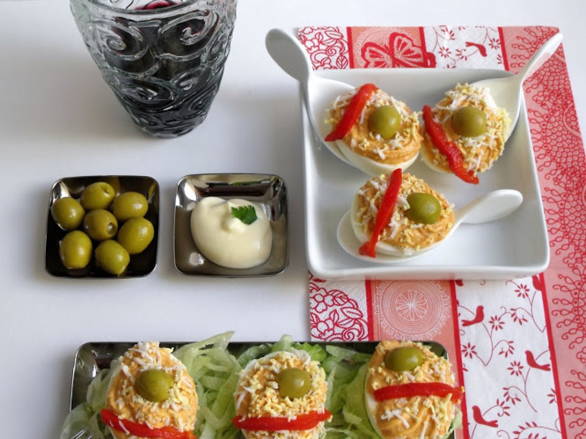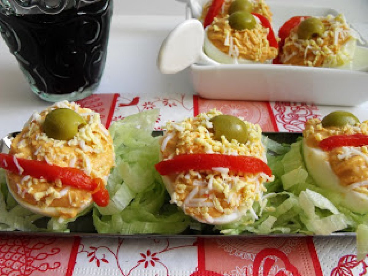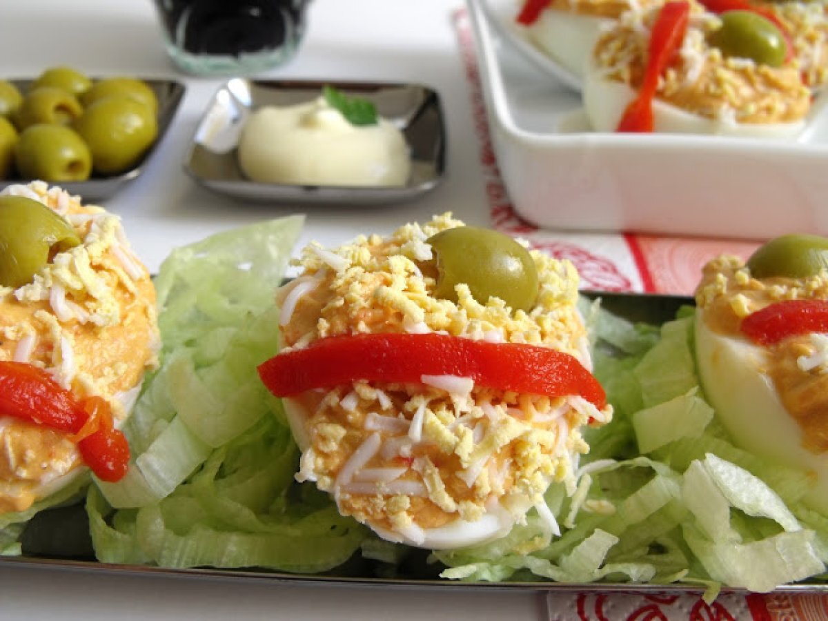 Rápida y sabrosa. Los huevos rellenos de atún con pimientos son un aperitivo fácil y rápido que combina huevos cocidos con un relleno cremoso de atún, pimientos del piquillo, aceitunas con sabor a anchoa y mayonesa. La preparación incluye cocer los huevos, triturar las yemas con los ingredientes y rellenar las claras, decorando con huevo rallado, pimientos y aceitunas. Este plato ofrece una textura suave y cremosa con un toque salado y ligeramente dulce, ideal para disfrutar sobre una cama de lechuga iceberg fresca.