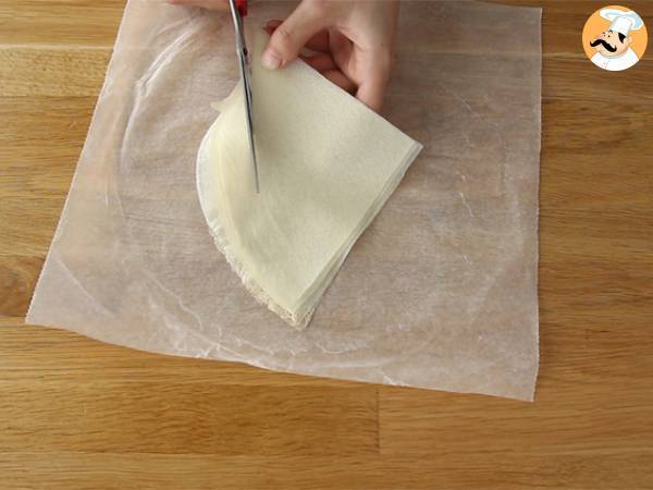 Superpón las hojas de masa brick y corta en 4 cuartos. Superpón todos los trozos y corta los bordes para que queden con forma de triángulo.