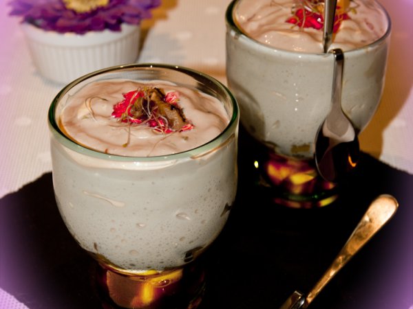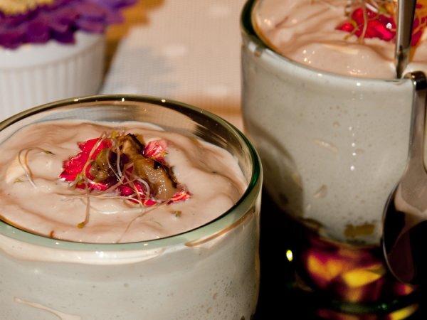 Espuma al aroma de foie sobre mango caramelizado AnteriorSiguiente AperitivoFácil20 min Enviar esta receta a un amigo Imprimir esta página Preguntar al autor Publicar la foto de esta receta Ingredientes 2 Para la espuma de foie: 100 g de foie de pato 1/4 litro de caldo de ave Sal, pimienta 200 ml. de nata 2 cargas de sifón Para el acompañamiento: azúcar moreno mango oporto nueces 1 cucharda de gelatina de fresa