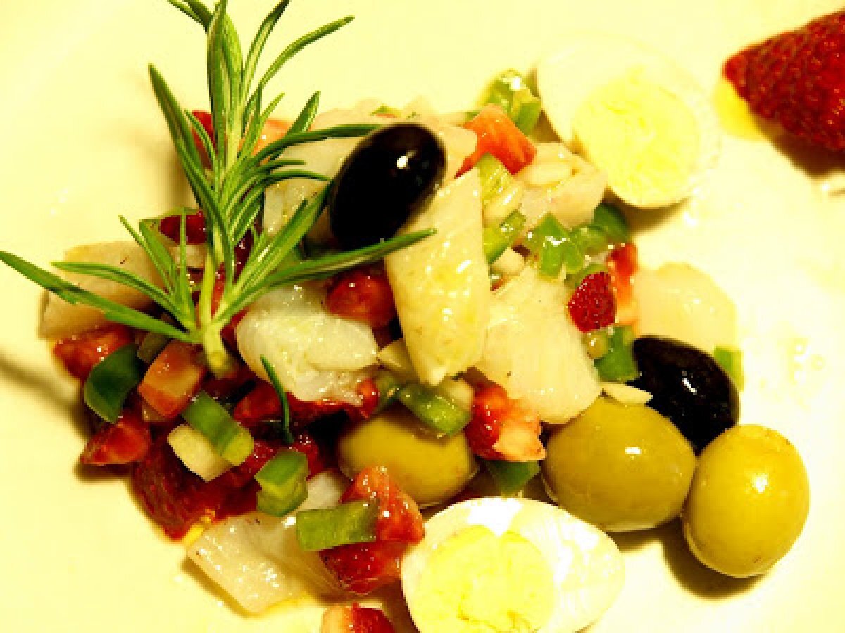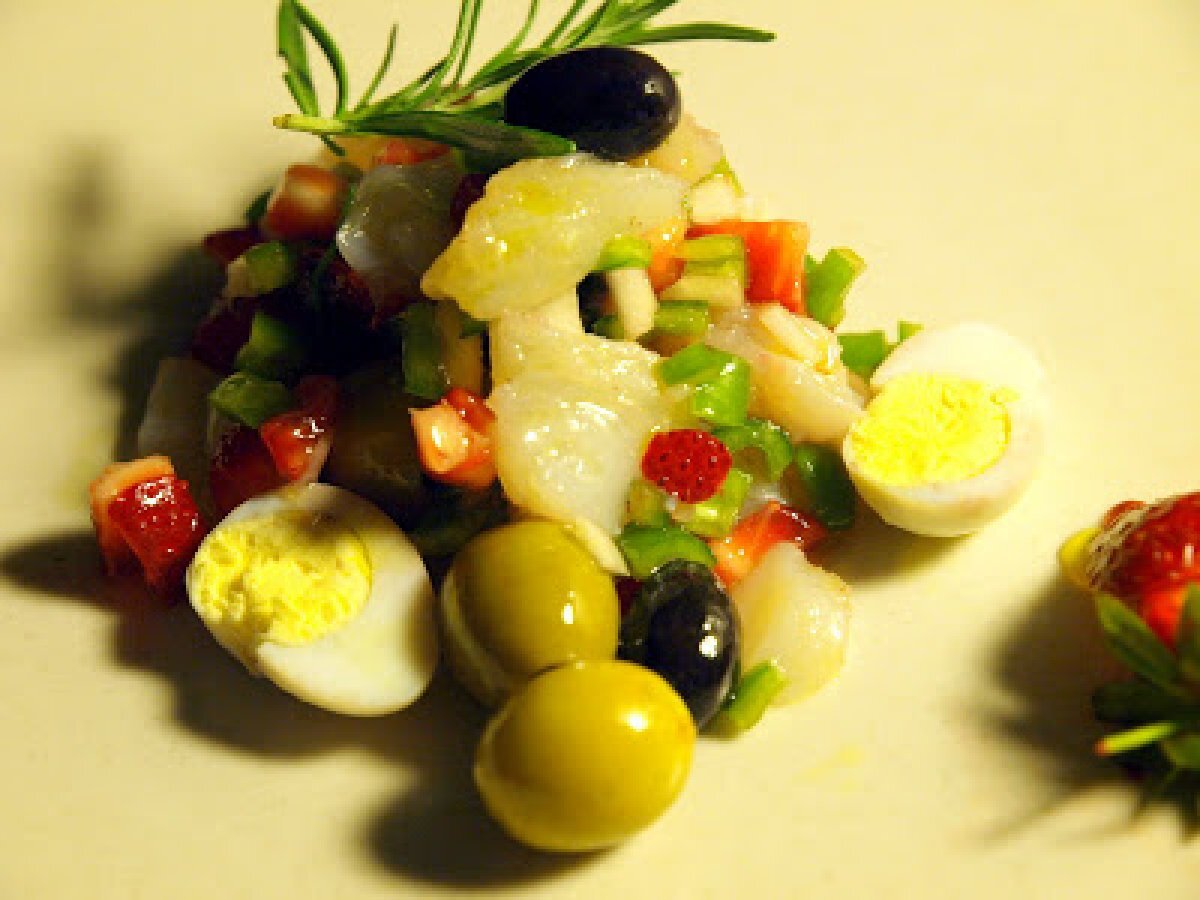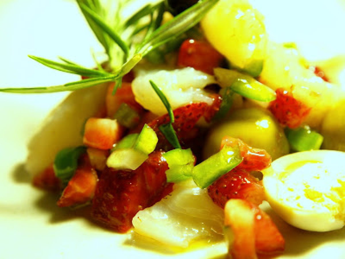 Esqueixada de bacalao y fresas vota ahora AnteriorSiguiente AperitivoFácil15 min Enviar esta receta a un amigo Imprimir esta página Preguntar al autor Publicar la foto de esta receta Ingredientes 2 para una sola persona: unos 100 g de bacalao desalado 8 fresas (variedad pájaro) 1 cebolleta medio pimiento verde olivas negras y rellenas 2 huevos de codorniz 1 ramita de romero fresco aceite y un poco de sal