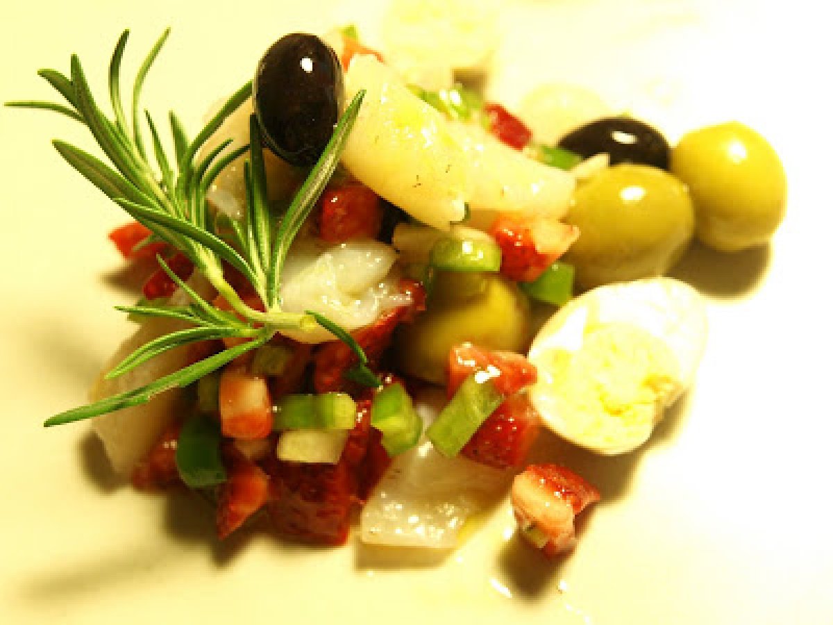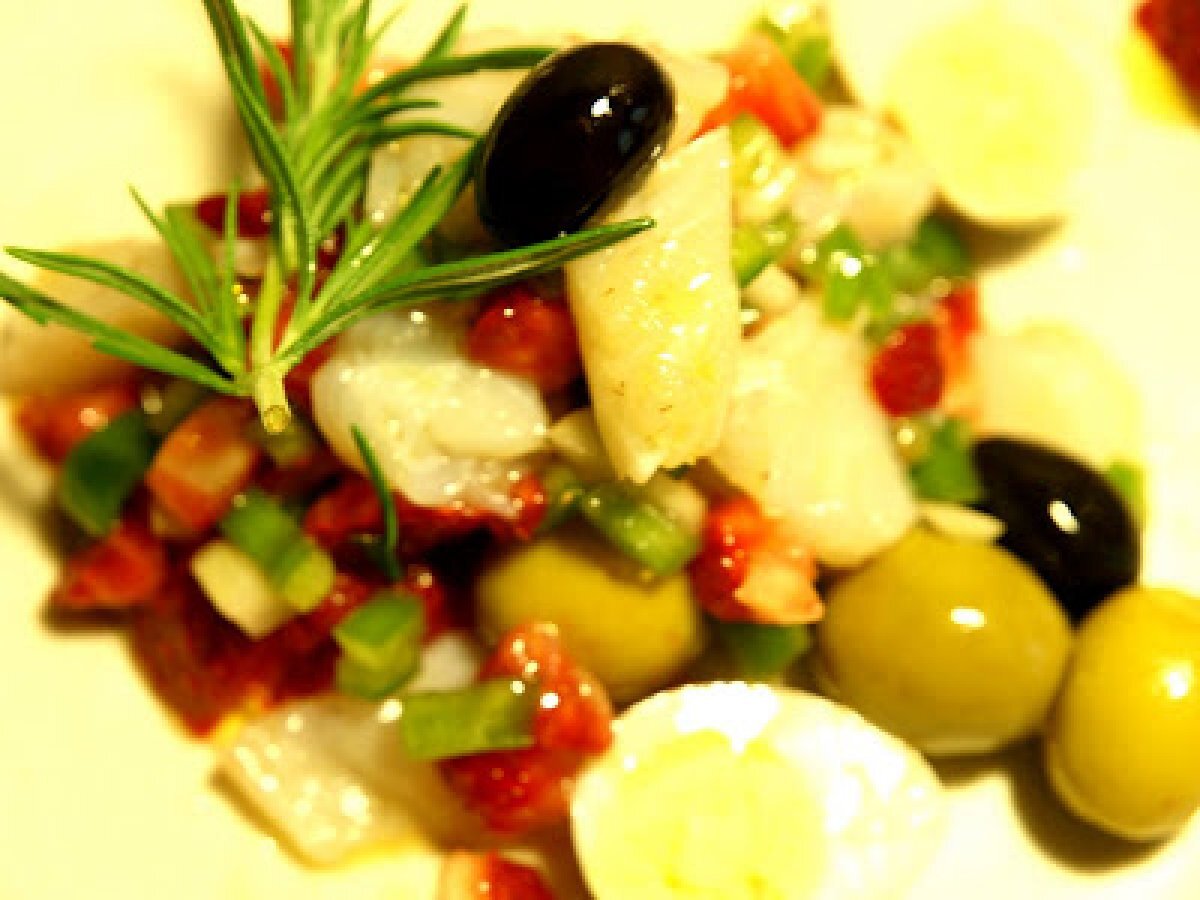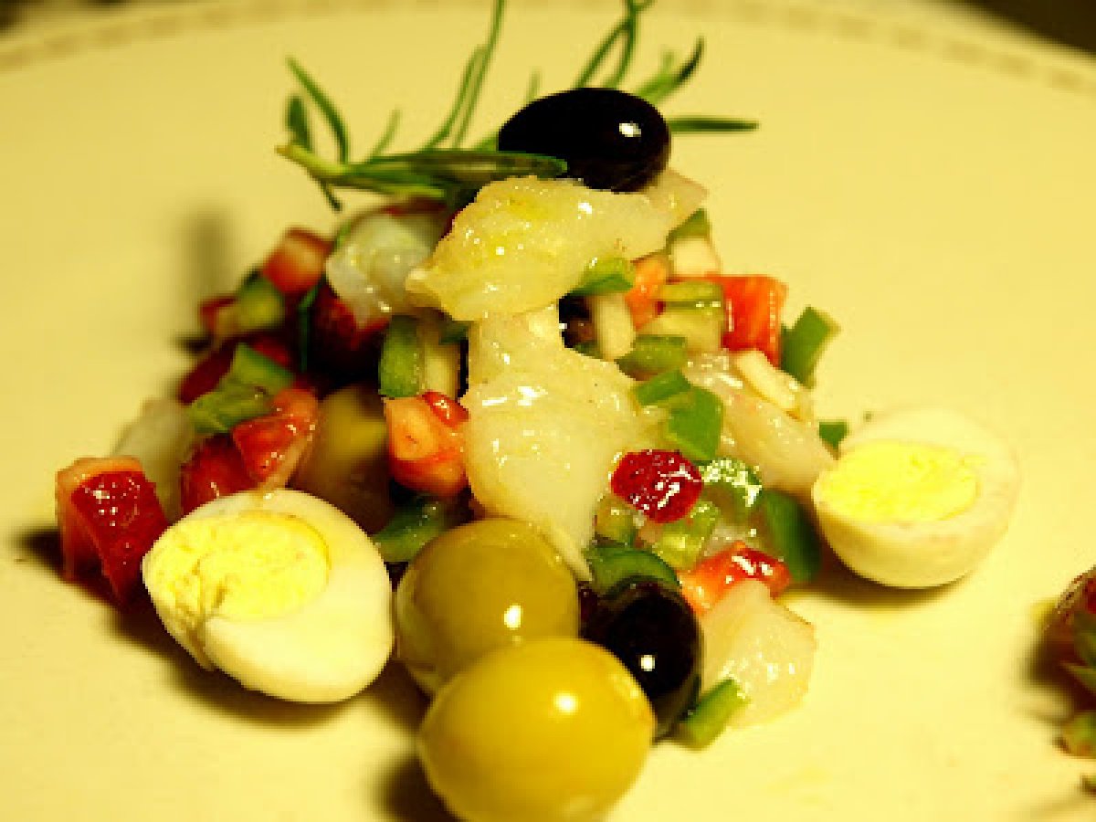 Esqueixada de bacalao y fresas vota ahora AnteriorSiguiente AperitivoFácil15 min Enviar esta receta a un amigo Imprimir esta página Preguntar al autor Publicar la foto de esta receta Ingredientes 2 para una sola persona: unos 100 g de bacalao desalado 8 fresas (variedad pájaro) 1 cebolleta medio pimiento verde olivas negras y rellenas 2 huevos de codorniz 1 ramita de romero fresco aceite y un poco de sal