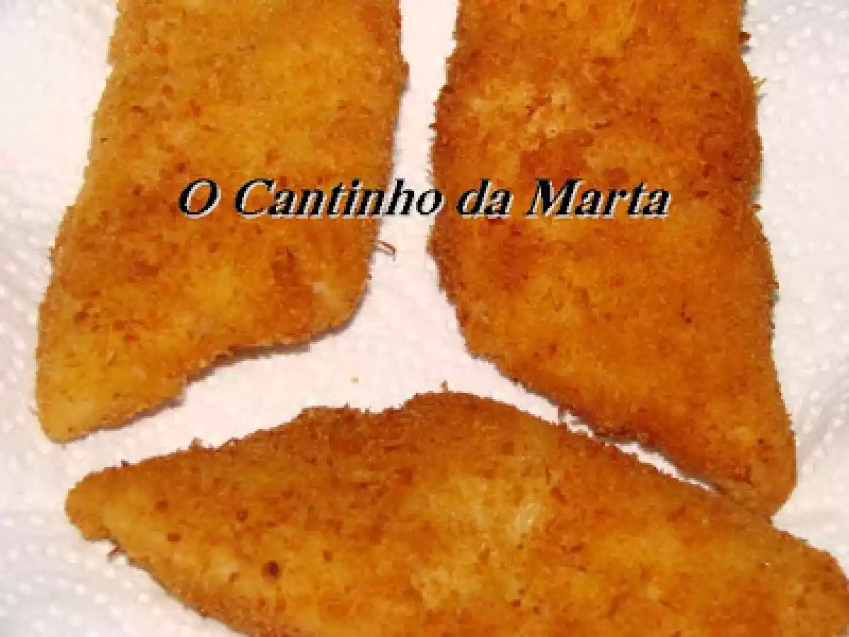 Filetes de pescada panados com coco ralado vota ahora AnteriorSiguiente AperitivoMedio40 min Enviar esta receta a un amigo Imprimir esta página Preguntar al autor Publicar la foto de esta receta Ingredientes 4 filetes de pescada ovo farinha sal pimenta limão coco ralado pão ralado