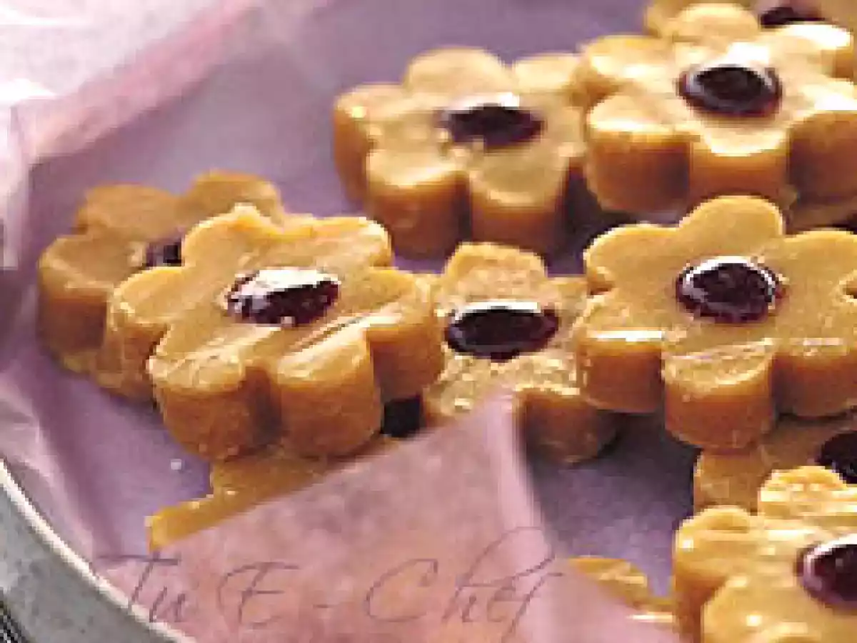 Flores de fudge de maní y jalea de moras (turrón) AperitivoFácil30 min1571 Kcal Enviar esta receta a un amigo Imprimir esta página Preguntar al autor Publicar la foto de esta receta Ingredientes 4 2 cucharadas de mantequilla sin sal, fría, y un poquitín más para la cacerola 3 cucharadas de miel ligera 1 taza de azúcar granulada 3 / 4 taza de azúcar morena (rubia) 3 / 4 taza de leche 1 pizca de bicarbonato de sodio (1/8 c) 1 / 2 cucharadita de sal 6 cucharadas de mantequilla de maní cremosa (suave) 1 cucharadita de extracto de vainilla 2 cucharadas de mermelada de mora Costo estimado: 3.77Euros€ (0.94€/porción)
