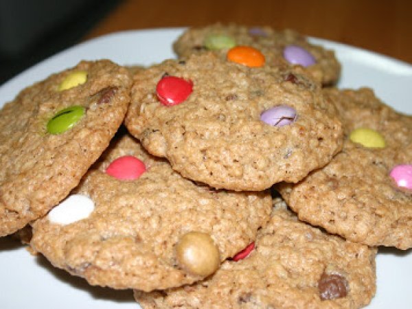 Galletas de avena, chocolate, frutos secos y lacasitos. AperitivoFácil30 min Enviar esta receta a un amigo Imprimir esta página Preguntar al autor Publicar la foto de esta receta Ingredientes 4 1 huevo grande sin cáscara. 125 g de aceite de maiz o girasol 50 g de azúcar moreno de caña 50 g de azúcar blanco 1 sobre de azúcar de vainilla o 1 cucharada pequeña de extracto de vainilla. 1/2 cucharada pequeña de sal. 1 cucharada pequeña de canela en polvo. 85 g de harina blanca 1/4 cucharada pequeña de bicarbonato 1/4 cucharada pequeña de levadura química 100 g de copos de avena 50 g de nueces peladas y troceadas 25 g de pasas 25 g de chocolate en gotas, o en pastilla troceado. Lacasitos para decorar ó M&M