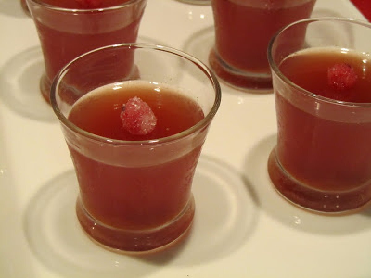 Gelatina de arándanos rojos AnteriorSiguiente AperitivoFácil25 min Enviar esta receta a un amigo Imprimir esta página Preguntar al autor Publicar la foto de esta receta Ingredientes 4 600 ml de Zumo de Arándanos Rojos 2 Naranjas6 hojas de Gelatina ½ cucharadita de Jengibre en polvo 1 palo de Canela 75 g de Azúcar 24 Arándonos Rojos 1 clara de Huevo