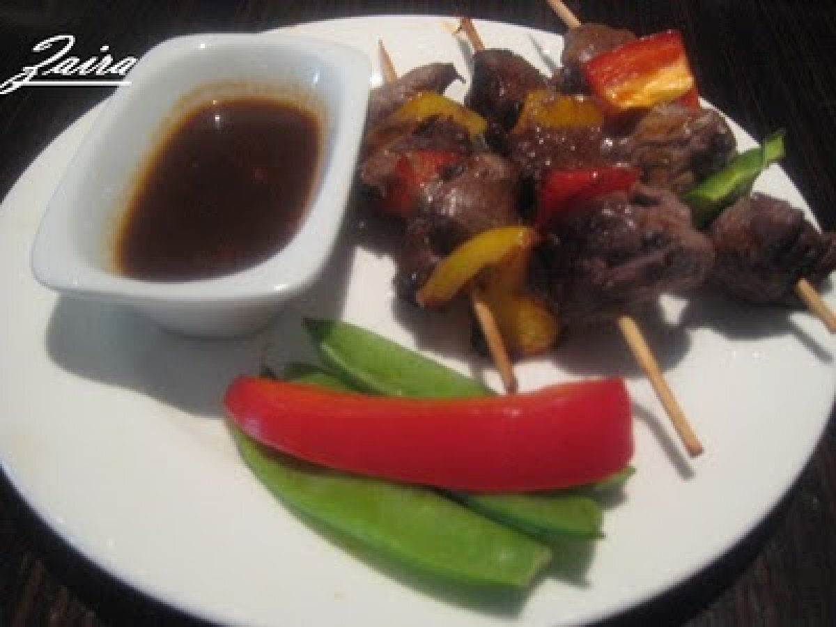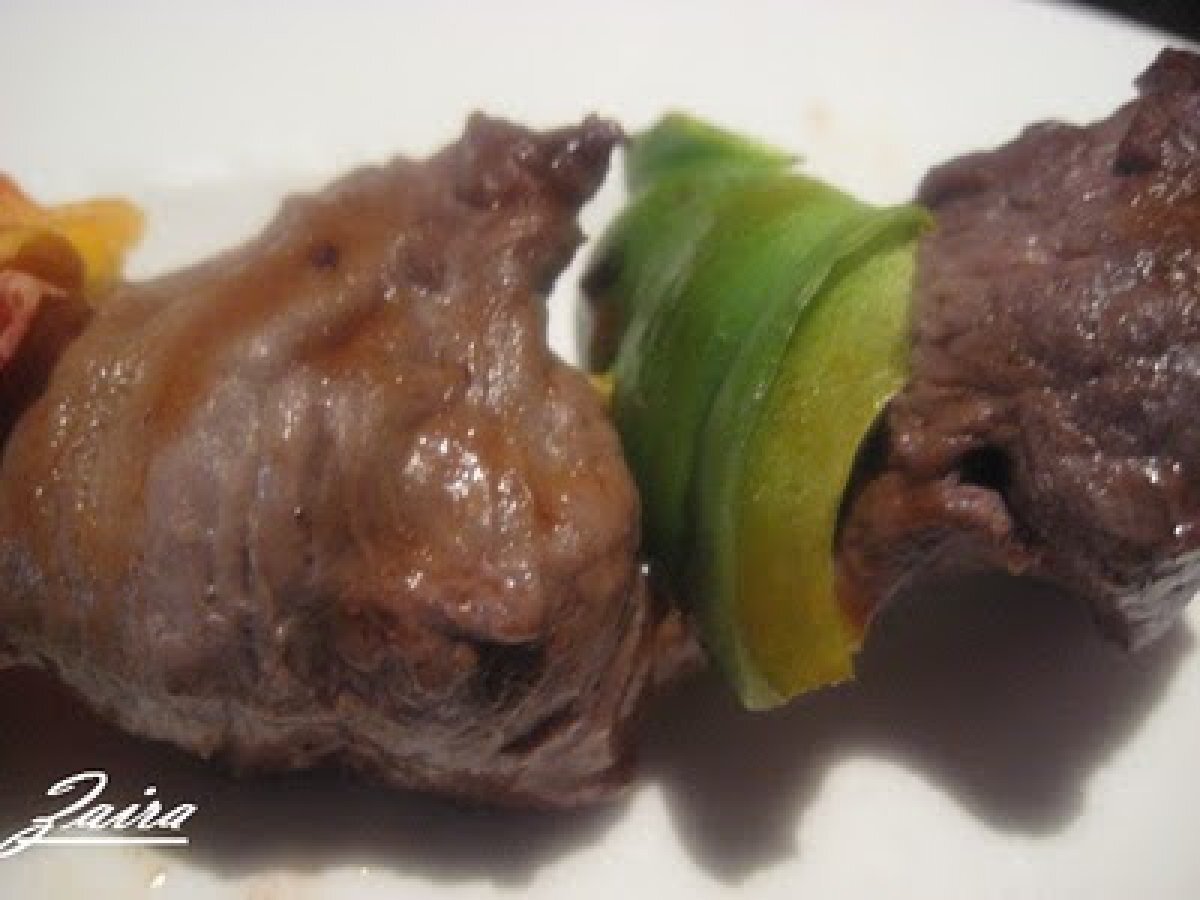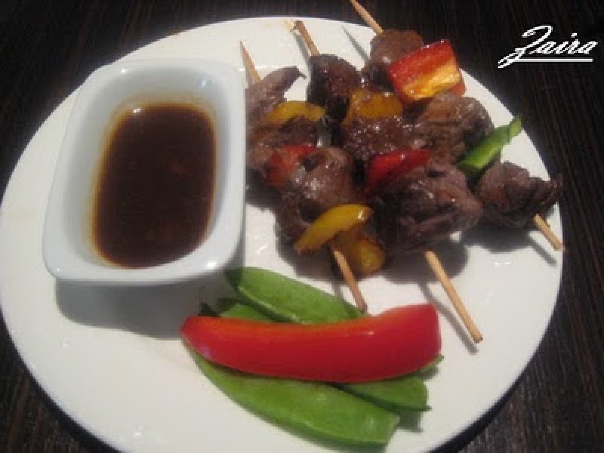 Hhdd 30. brochetas de carne de vacuno. brochetas de ternera con yogur y pimentón. AnteriorSiguiente AperitivoFácil1 h 10 m Enviar esta receta a un amigo Imprimir esta página Preguntar al autor Publicar la foto de esta receta Ingredientes 6 1 kg y 1/4 de lomo de ternera cortado en dados 1 taza de yogur líquido 3 cucharadas soperas de tomate concentrado 2 pimientos rojos 3 cebollas 3 pimientos verdes 2 pimientos amarillosun poco de pimentón dulce un poco de aceite de oliva sal y pimienta un poco de "sumac" 2 dl de bebida de cola 200 g de buena salsa de tomate 1/2 dl de vinagre de manzana o de jerez 1 cucharada sopera de mostaza pimienta