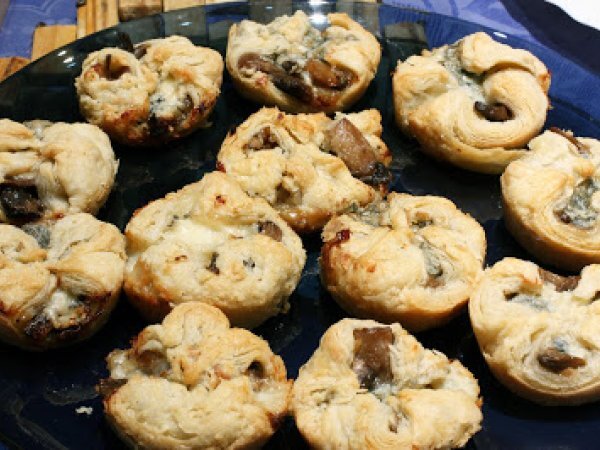 Hojaldritos rellenos de champiñones y gorgonzola vota ahora AnteriorSiguiente AperitivoFácil55 min202 Kcal Enviar esta receta a un amigo Imprimir esta página Preguntar al autor Publicar la foto de esta receta Ingredientes 12 300 g hojaldre 30 g mantequilla 2 cucharadas aceite oliva 2 dientes de ajo 1/2 cebolla 300 g champiñones 6 cl vino blanco de calidad un paquete queso gorgonzola sal y pimienta al gusto Costo estimado: 4.3Euros€ (0.36€/porción)