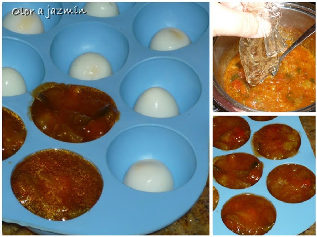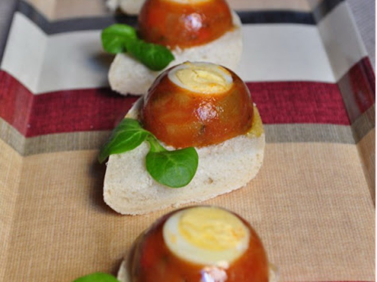 Huevos de codorniz y pisto en gelatina AnteriorSiguiente AperitivoFácil30 min Enviar esta receta a un amigo Imprimir esta página Preguntar al autor Publicar la foto de esta receta Ingredientes 2 12 huevos de codorniz pisto casero como tengáis costumbre de hacerlo, con las verduras picadas muy menudas tomillo, orégano,... (especias al gusto para condimentar el pisto) 3 hojas de gelatina (5 g) 24 tostaditas o trocitos de pan blanco aceite de oliva cebollino, canónigos,... (para decorar)