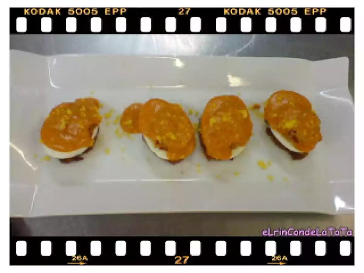 Huevos rellenos de jamon y queso con salsa piquillo AperitivoFácil55 min184 Kcal Enviar esta receta a un amigo Imprimir esta página Preguntar al autor Publicar la foto de esta receta Ingredientes 4 Huevos 1 cebolla 1-2 pimientos del piquillo Jamón york Queso rallado Pan frito Salsa de pimientos piquillo Costo estimado: 3.11Euros€ (0.78€/porción)