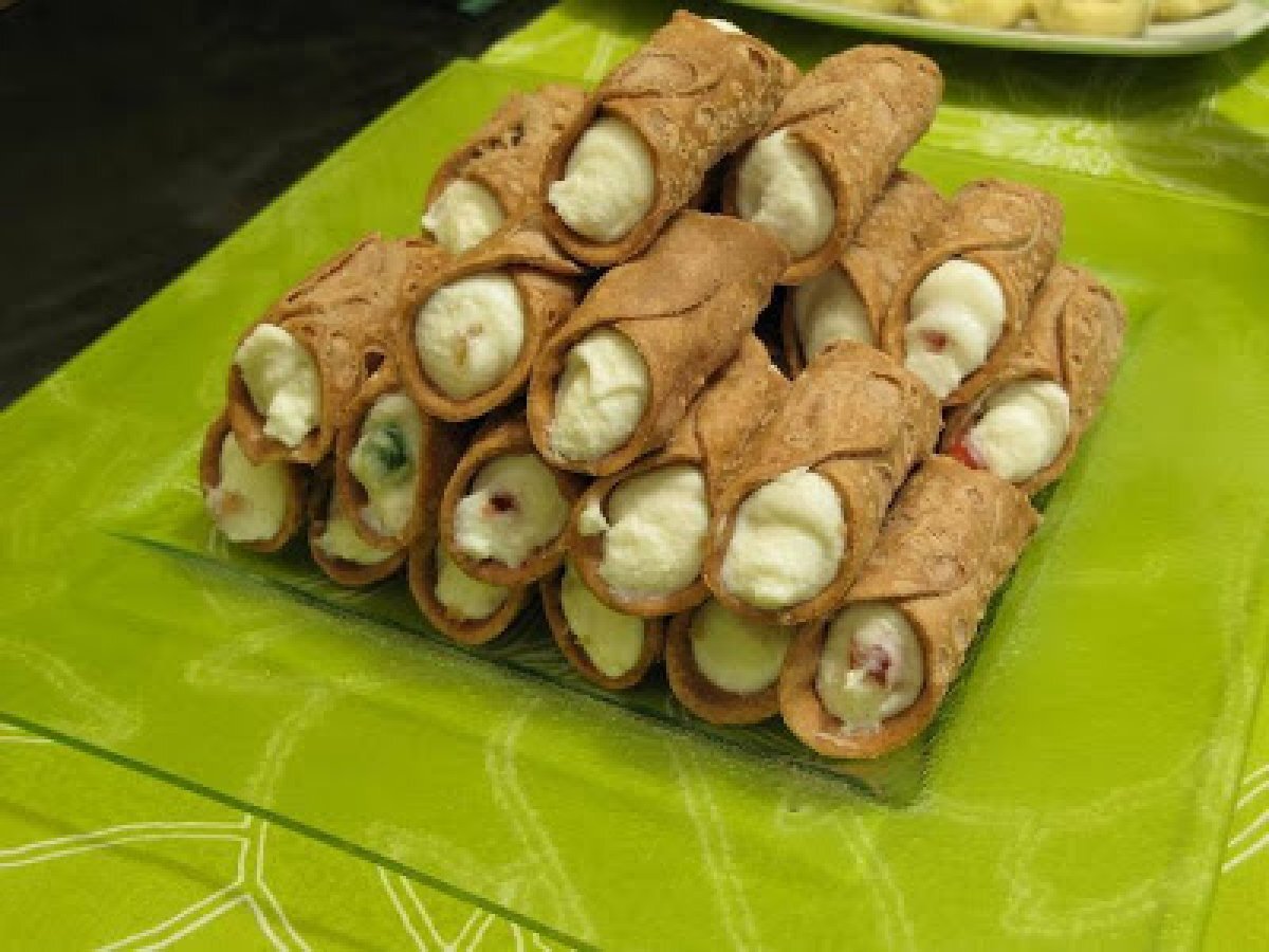 - Para el relleno, derretir el chocolate y pincelar el interrior del cannoli y dejar secar. Mesclar la ricotta con el azucar y rellenar los cannolis. Los extremos se pueden decorar con nueces, pistachos o almendras molidas y espolvorearlos con azúcar impalpable.