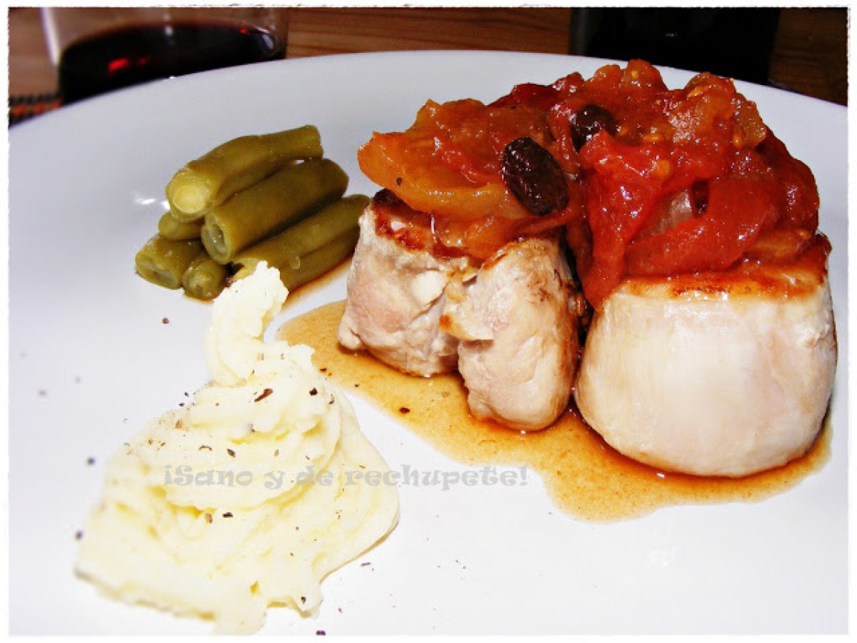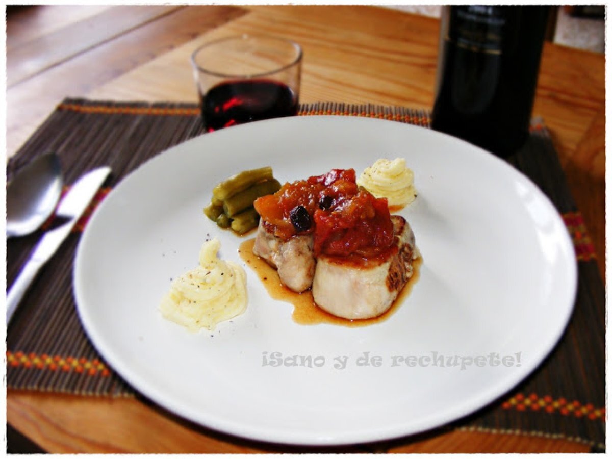 Medallones de solomillo con chutney de tomate vota ahora AnteriorSiguiente AperitivoFácil30 min Enviar esta receta a un amigo Imprimir esta página Preguntar al autor Publicar la foto de esta receta Ingredientes 1 2-3 medallones gorditos de solomillo de cerdo por persona chutney de tomate sal de escamas puré de papas unas habichuelas o judías verdes AOVE