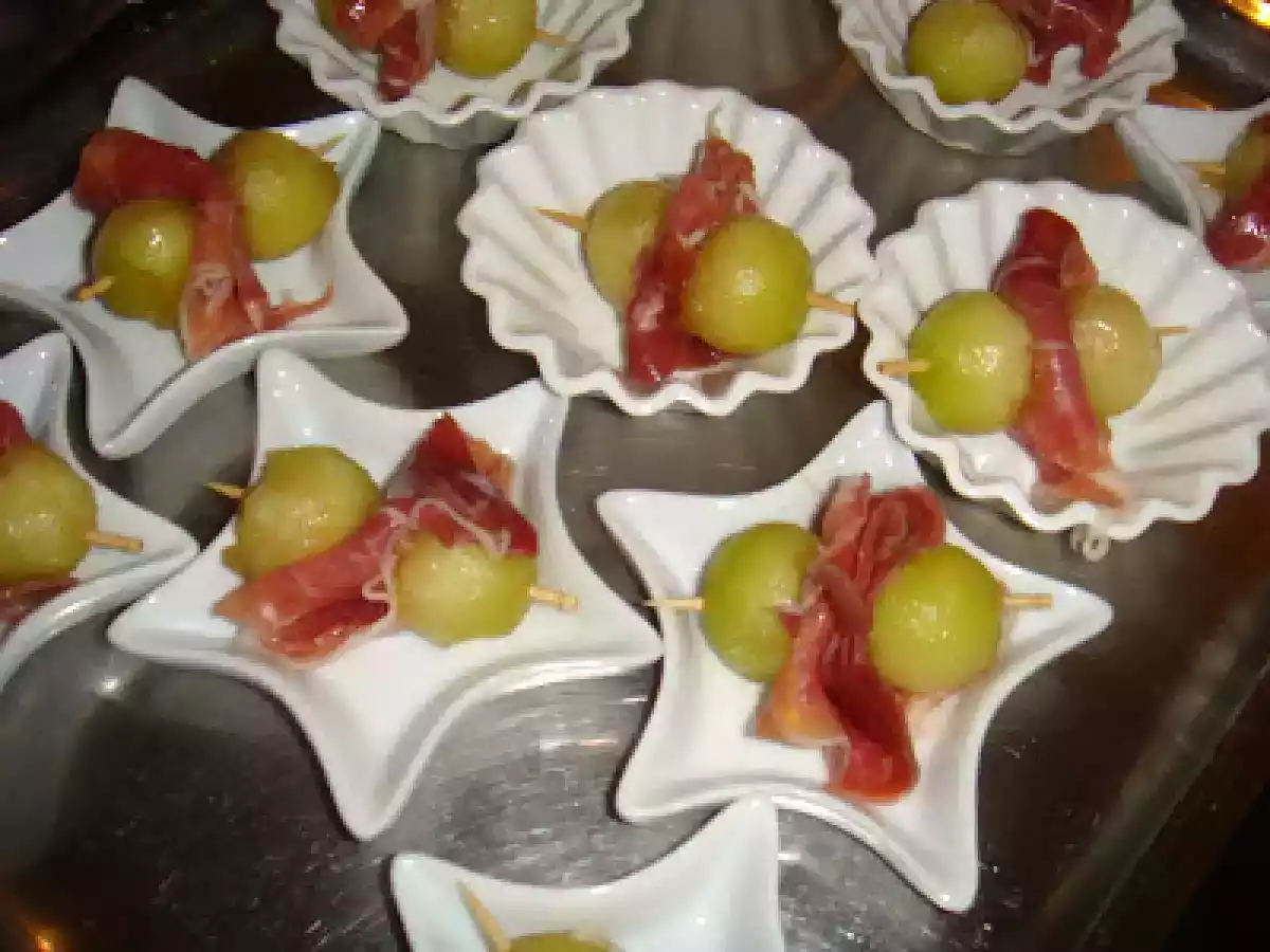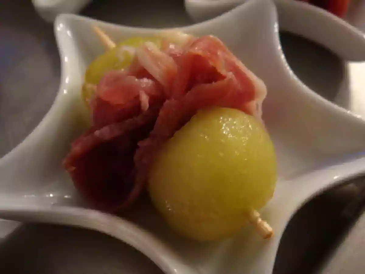 Mini brocheta de melón con jamón AnteriorSiguiente AperitivoFácil30 min Enviar esta receta a un amigo Imprimir esta página Preguntar al autor Publicar la foto de esta receta Así de fácil, igual de simple e igual de bono. Ingredientes 2 1 Melón de Cantaloup ó Galia 6 lonchas de Jamón Serrano ½ copita de Oporto 12 Palillos de dientes