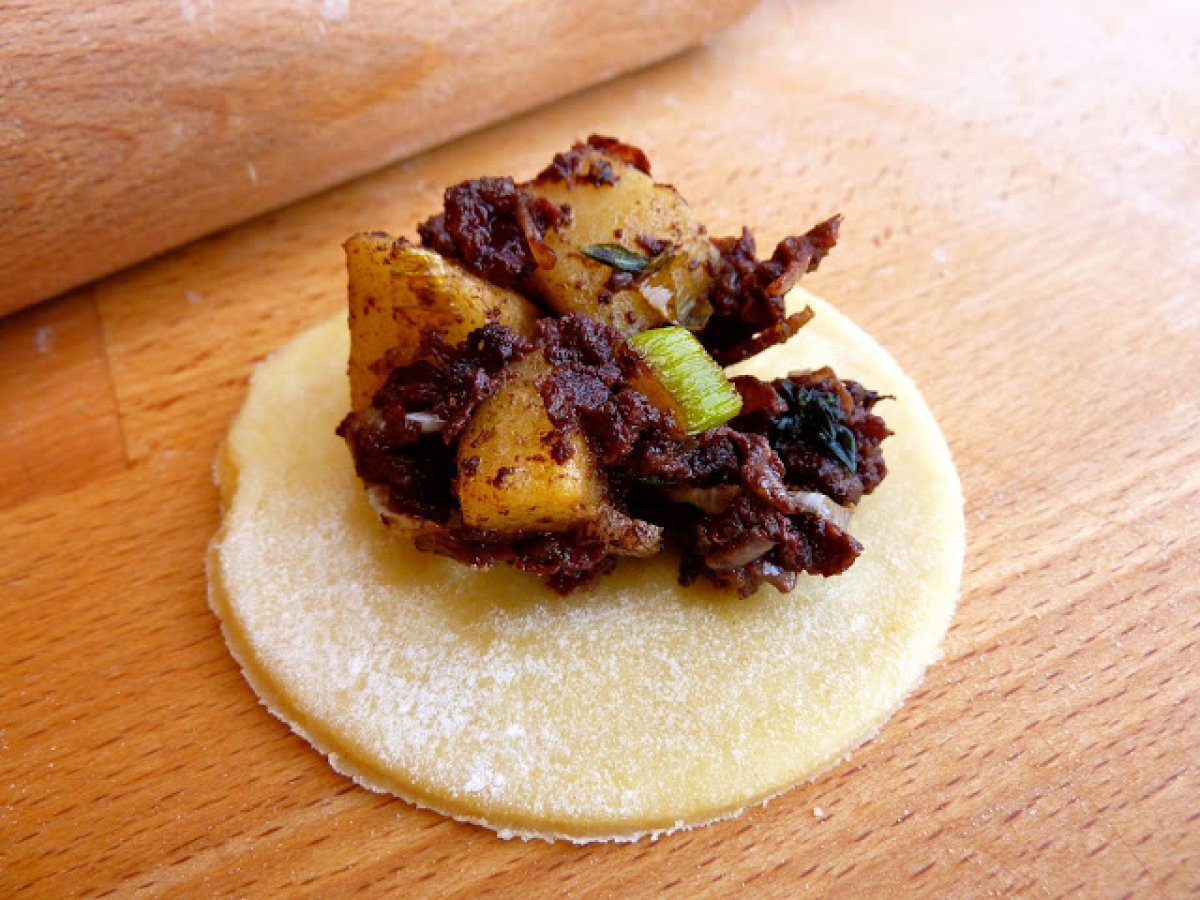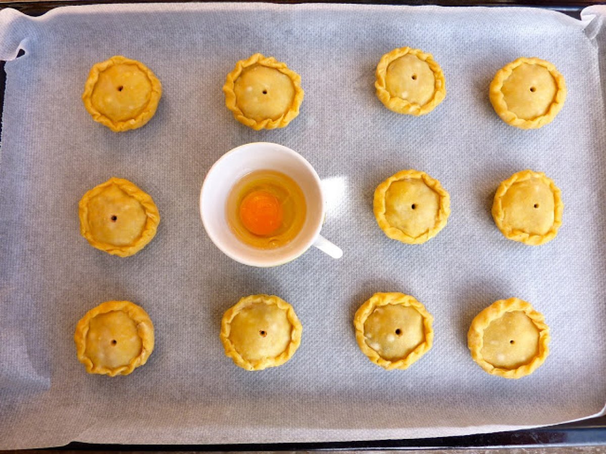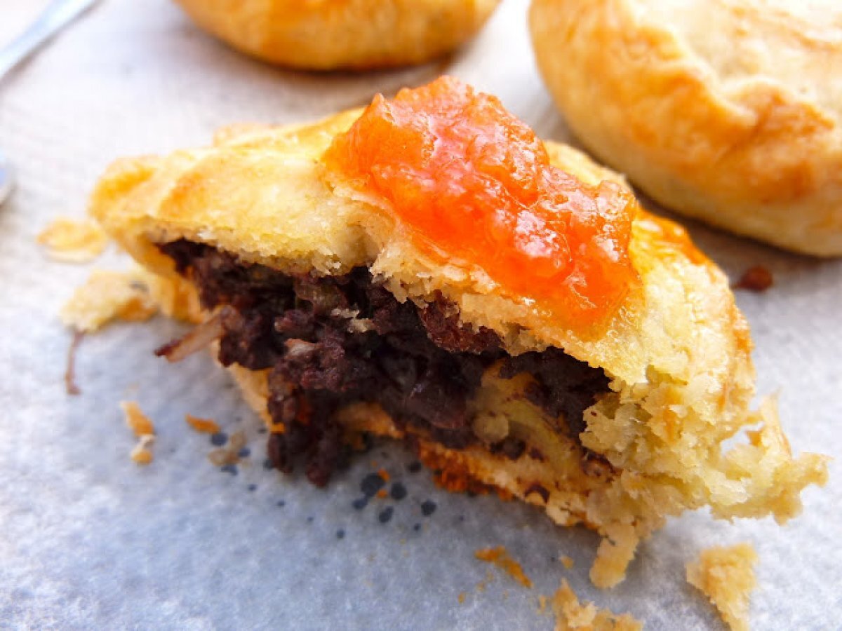 Mini empanaditas de morcilla, manzana y beicon. AnteriorSiguiente AperitivoFácil40 min1615 Kcal Enviar esta receta a un amigo Imprimir esta página Preguntar al autor Publicar la foto de esta receta Ingredientes 2 400 g de masa de hojaldre, o bien si os queréis complicar un poco mas esta masa de Michel Roux. 1 o dos cebolletas tiernas cortadas en rodajitas. 2 lonchas de beicon picadas. 2 cucharadas de pasas. 1 manzana ácida, Grany Smith por ejemplo. Pelada y cortada en trocitos de 1 cm. 200 g de morcilla sin piel y desmenuzada. 2 cucharadas de tomillo fresco. Sal y pimienta negra. 1 huevo batido. Aceite de oliva.