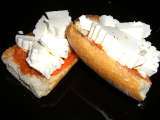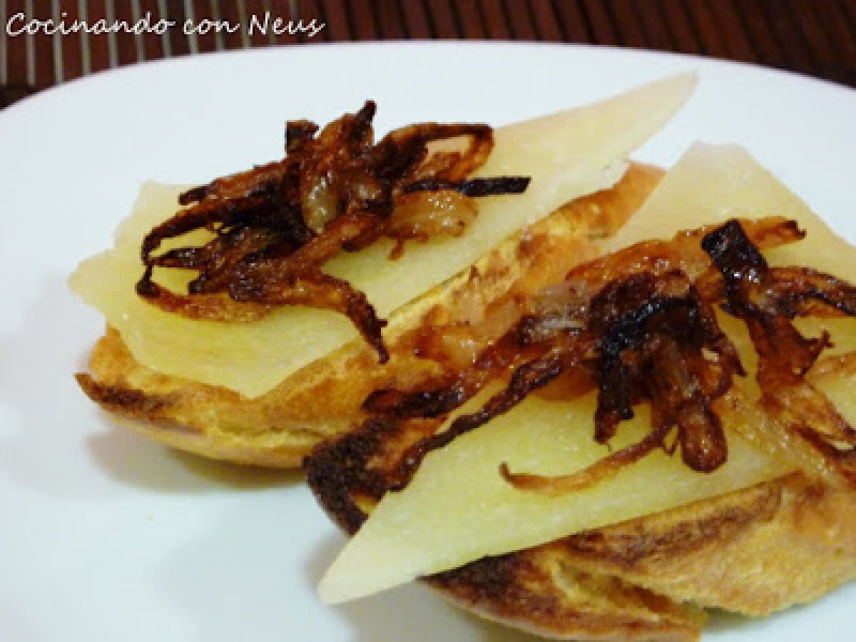 Montadito de queso idiazábal y chips de cebolla AperitivoFácil50 min Enviar esta receta a un amigo Imprimir esta página Preguntar al autor Publicar la foto de esta receta Ingredientes 2 rebanadas de pan tostado una loncha de queso para cada rebanada cortado fino 1 cebolla pimienta en grano aceite de oliva virgen un poquito de miel un vaso de leche