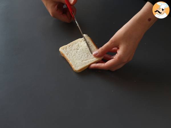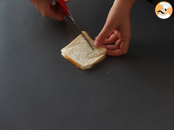 Con unas tijeras, corta la primera rebanada de pan empezando por una esquina, ligeramente en diagonal (hacia el lado superior), pero sin llegar hasta el final.