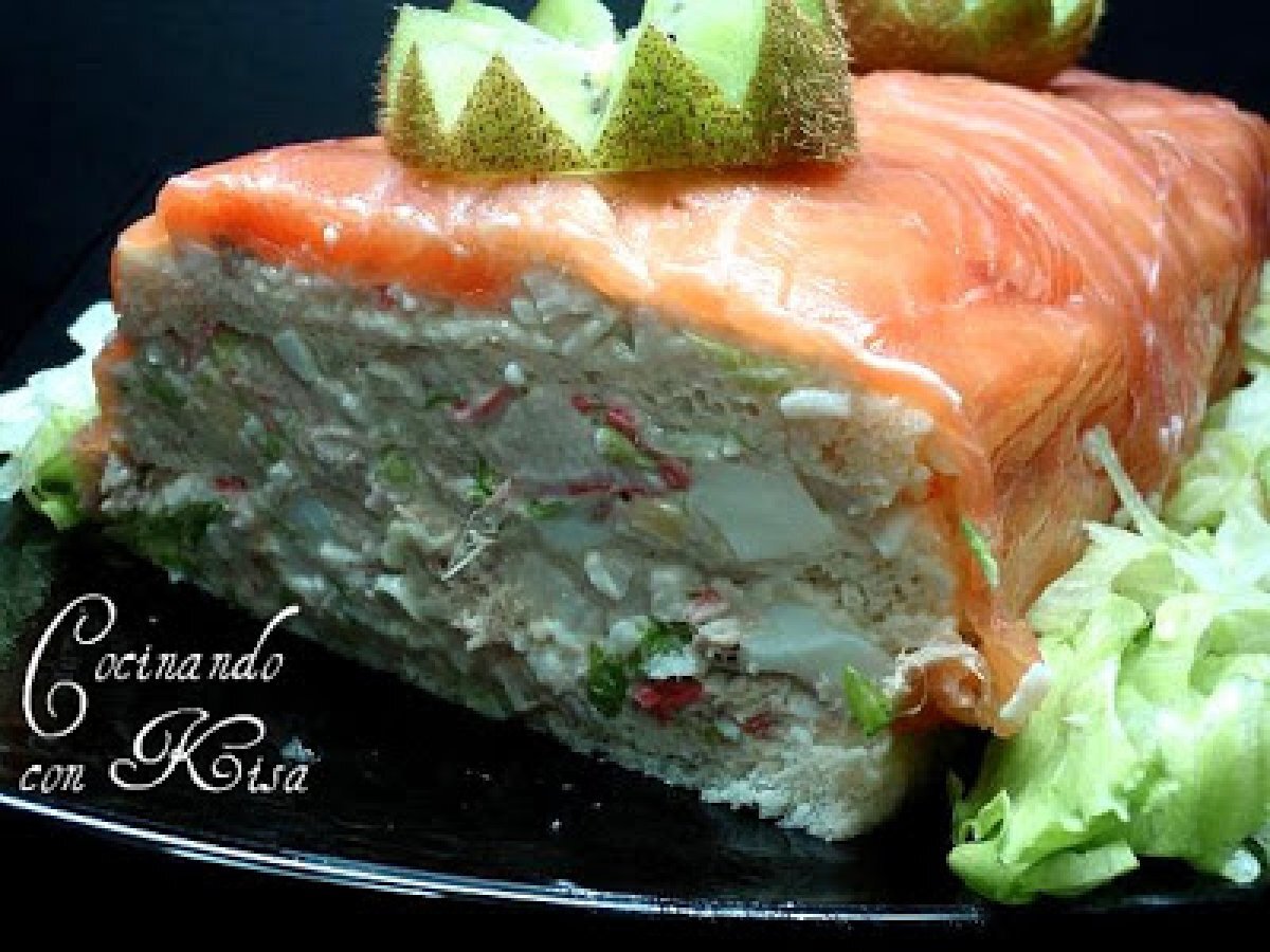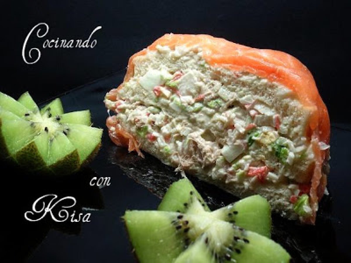 Pastel de verano AnteriorSiguiente AperitivoFácil50 min Enviar esta receta a un amigo Imprimir esta página Preguntar al autor Publicar la foto de esta receta Ingredientes 2 7 y ½ lonchas de pan de molde sin corteza 15 palitos de surimi o palitos de cangrejo 250 o 300 g de salmón ahumado en lonchas 4 hojas de lechuga iceberg 2 latas de atún en escabeche de las pequeñas 2 huevos cocidos Mahonesa