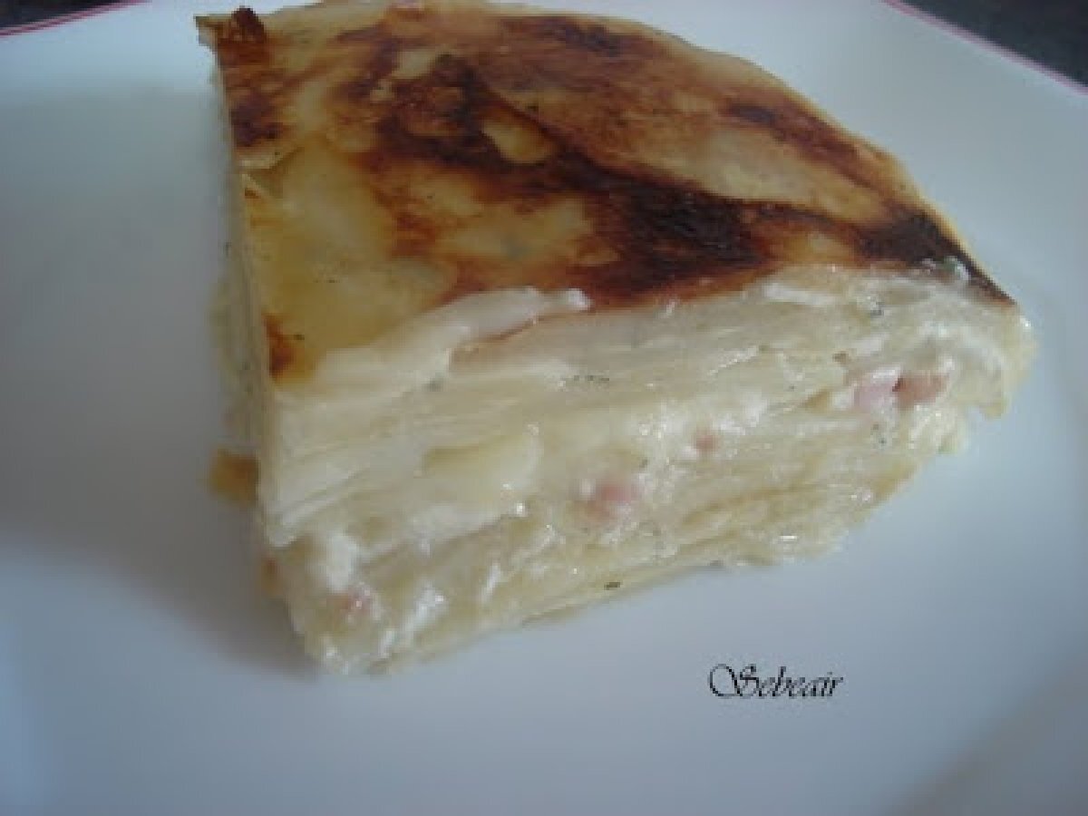 Patatas gratinadas a la francesa AnteriorSiguiente AperitivoFácil50 min567 Kcal Enviar esta receta a un amigo Imprimir esta página Preguntar al autor Publicar la foto de esta receta Ingredientes 4 550 g de patatas peladas 7 lonchas de queso tipo tranchetes light 2 huevos 120 g de bacon en trozos (una tarrina) 250 ml de leche entera 200 ml de nata líquida 18% materia grasa 6 cucharadas de café de margarina 2 cucharadas de café de ajo seco 2 cucharadas de café de perejil seco 1 pastilla de caldo de pollo Pimienta blanca molida y sal Costo estimado: 5.67Euros€ (1.42€/porción)