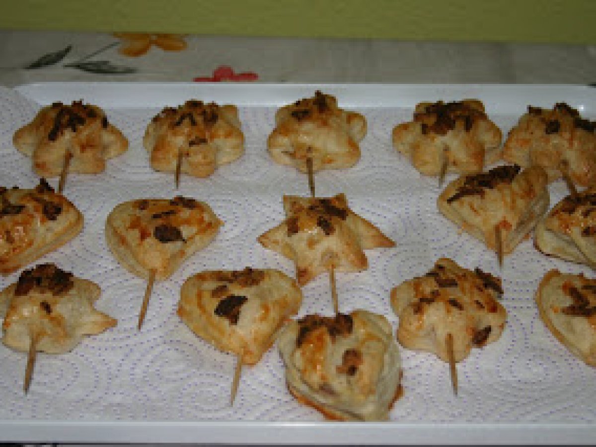 Piruletas de hojaldre rellenas . AperitivoFácil1 hora395 Kcal Enviar esta receta a un amigo Imprimir esta página Preguntar al autor Publicar la foto de esta receta Ingredientes 4 Una masa de hojaldre 1 huevo cebolla frita bacon en trozos queso para pasta Arla Finello Costo estimado: 1.55Euros€ (0.39€/porción)