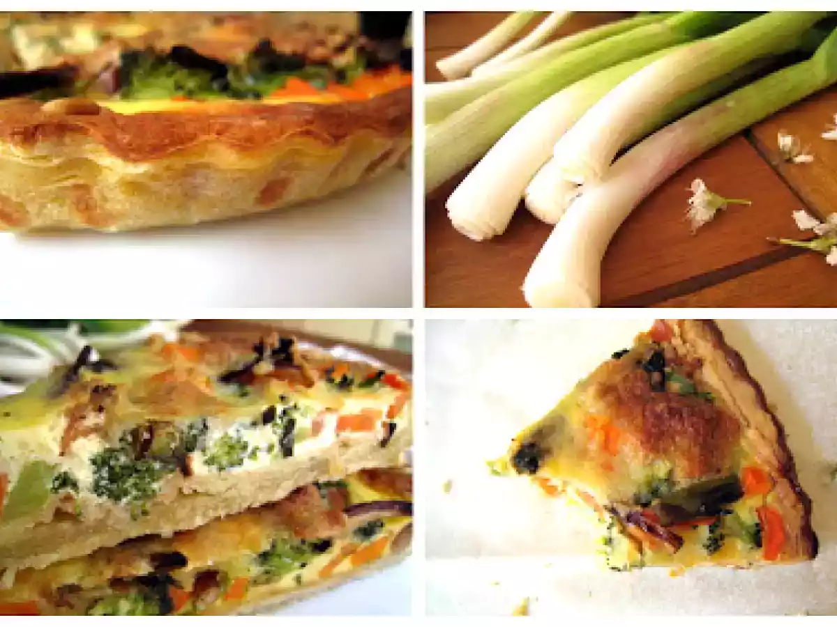 Quiche de brocoli, zanahoria y ajos tiernos AnteriorSiguiente AperitivoFácil45 min737 Kcal Enviar esta receta a un amigo Imprimir esta página Preguntar al autor Publicar la foto de esta receta Ingredientes 4 PARA LA MASA QUEBRADA: 250 g de harina 120 g de mantequilla a trocitos 1 huevo 1/2 cucharadita de sal 1/2 cucharadita de azúcar PARA EL RELLENO: 250 g Zanahoria 200 g Brécol 150 g Ajos tiernos 25 g piñones 200 g nata 100 g Queso Emmental 3 huevos Sal Pimienta