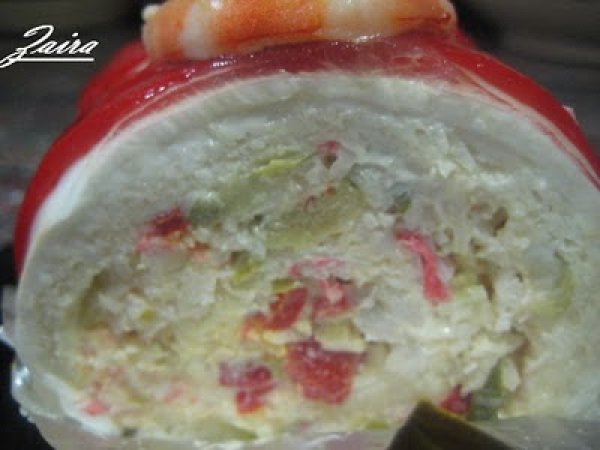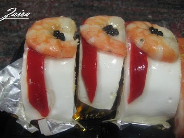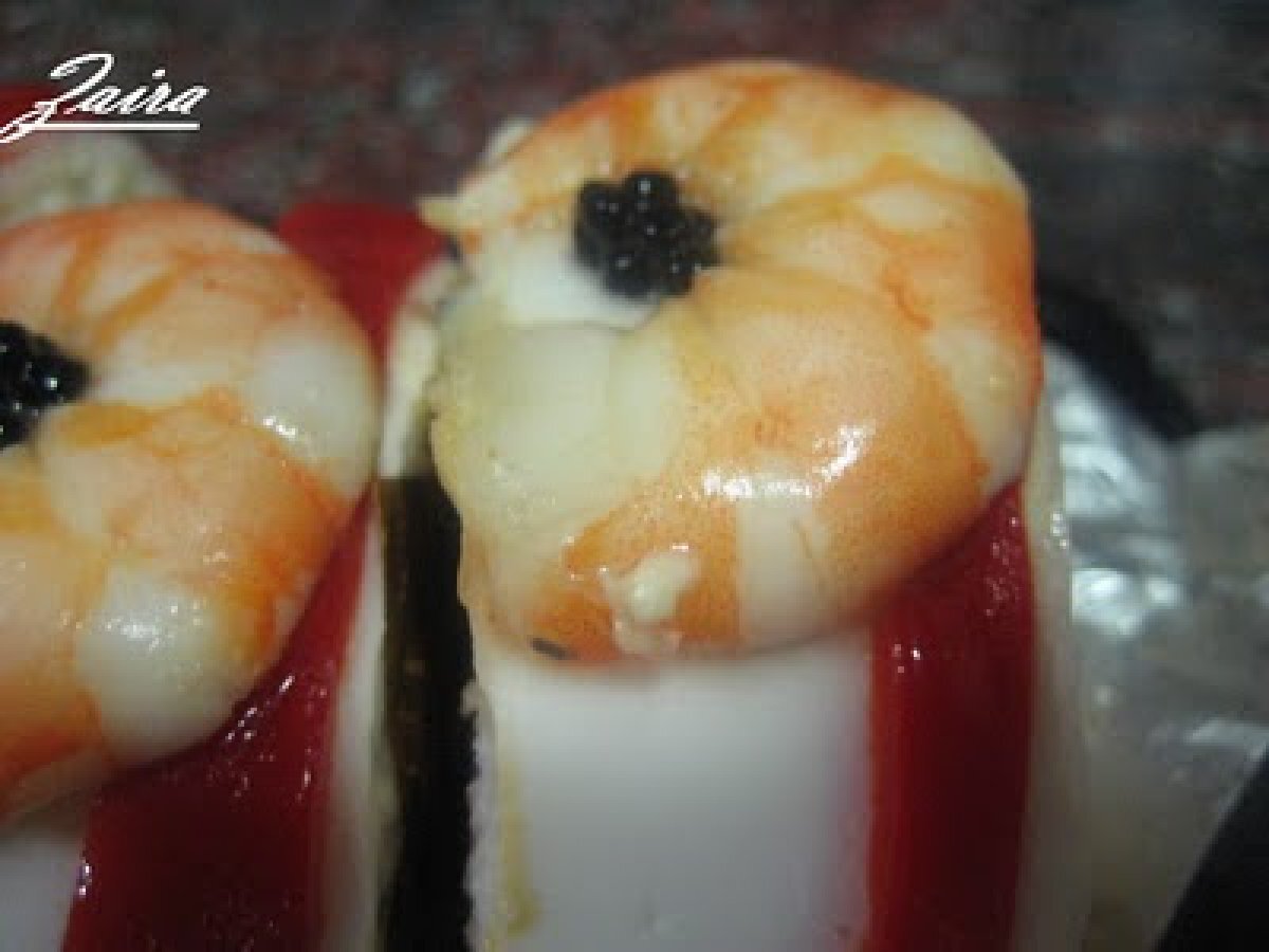 Rollitos de ensaladilla con langostinos AnteriorSiguiente AperitivoFácil20 min Enviar esta receta a un amigo Imprimir esta página Preguntar al autor Publicar la foto de esta receta Ingredientes 3 6 láminas largas de pan de tipo molde muy flexible (se vende en lugares especializados) 3 patatas cocidas 3 zanahorias cocidas 200 g de langostinos cocicdos y troceados 3 huevos duros 1 bote de mahonesa suave aceitunas verdes picadas tiras de pimiento rojo o del piquilo asado 18 langostinos cocidos y pelados pero enteros huevas de mújol