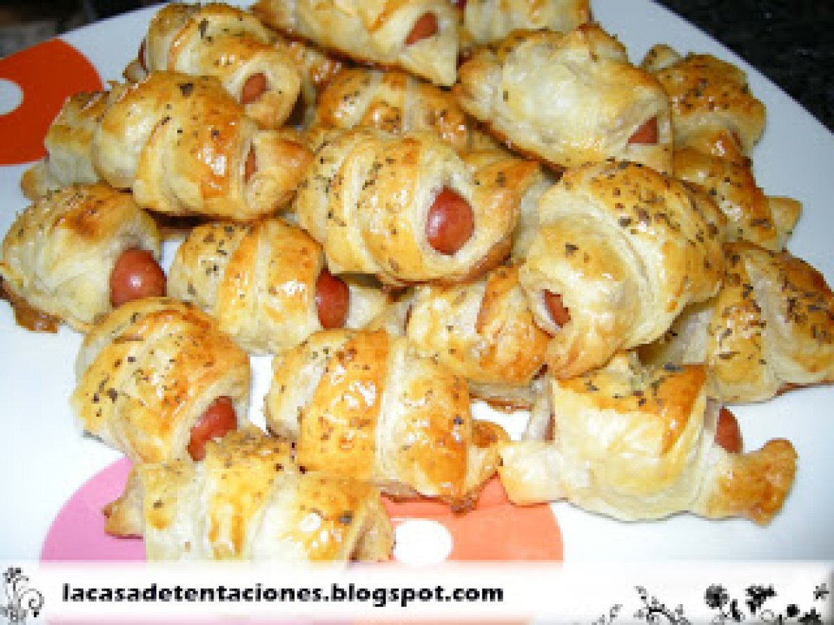 - Lo primero que hacemos es cortar el hojaldre en forma de triangulo. Vamos enrollando las salchichas, la ponemos en el trozo más grande y la enrollamos hacia el más pequeño, sin apretar mucho.