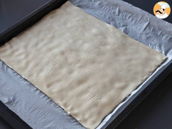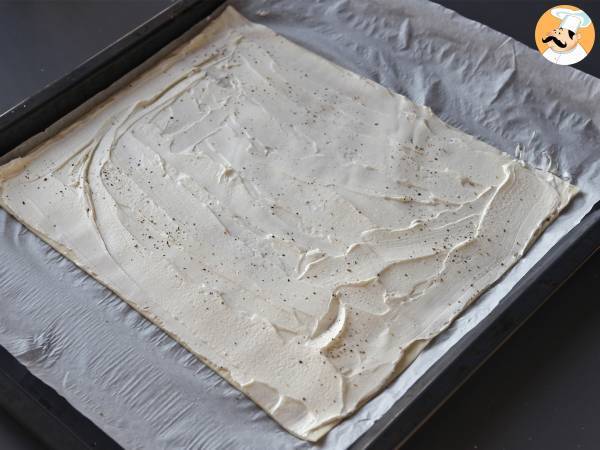 Colocar el hojaldre rectangular en una bandeja de horno (en la que habremos puesto papel sulfurizado o de aluminio) y extender sobre ella una capa uniforme de queso crema.