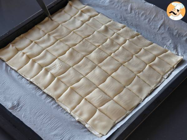 Con el pulgar, presionar ligeramente en el centro de cada cuadrado (para crear una cavidad poco profunda). Con la ayuda de un tenedor, agujerea la masa para que no se infle en el exceso.