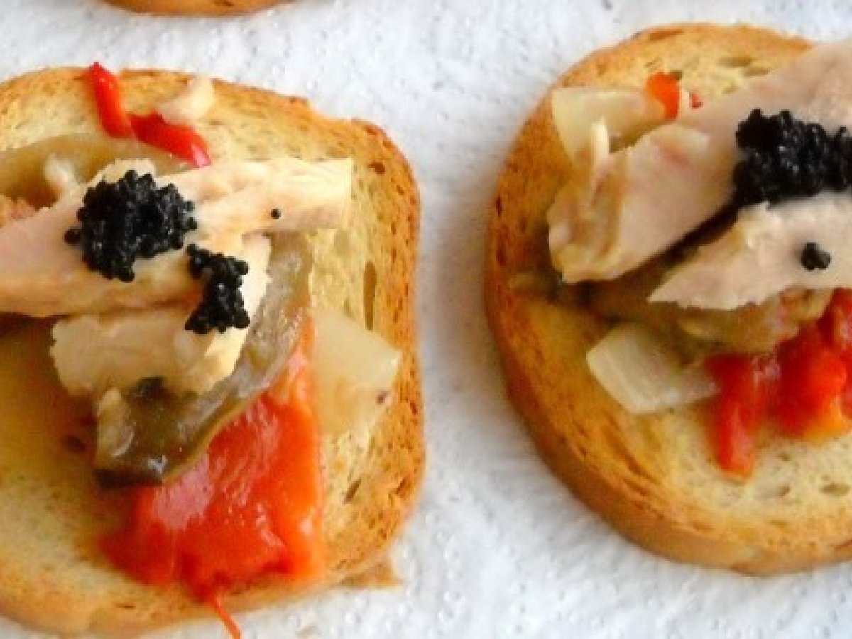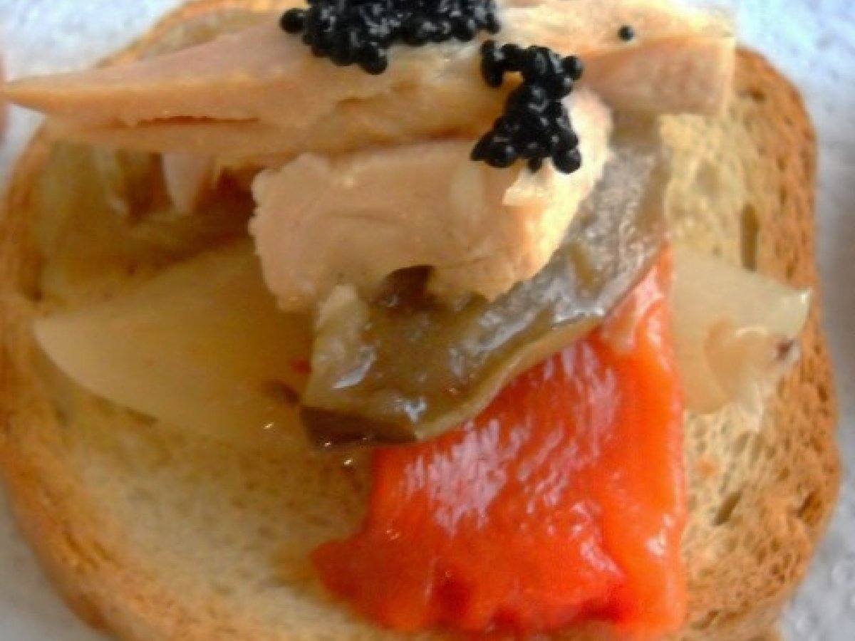 Tapa de escalivada con bonito del norte vota ahora AnteriorSiguiente AperitivoFácil25 min Enviar esta receta a un amigo Imprimir esta página Preguntar al autor Publicar la foto de esta receta Ingredientes 1 1 bote de bonito del norte de Conservas Serrats 1 cebolla 1 berenjena 1 pimiento rojo Caviar Tostadas Ajo Perejil Sal Aceite de oliva