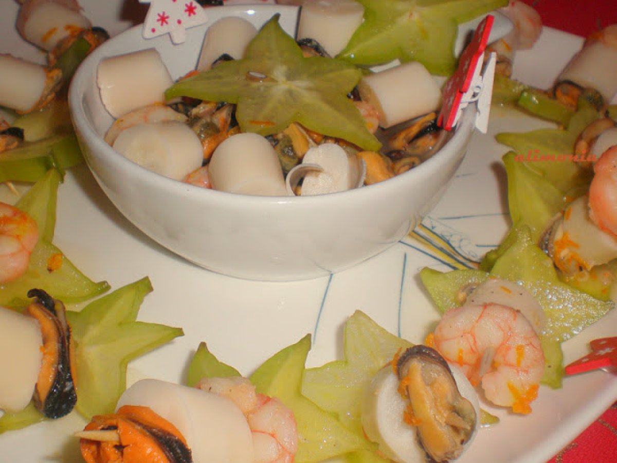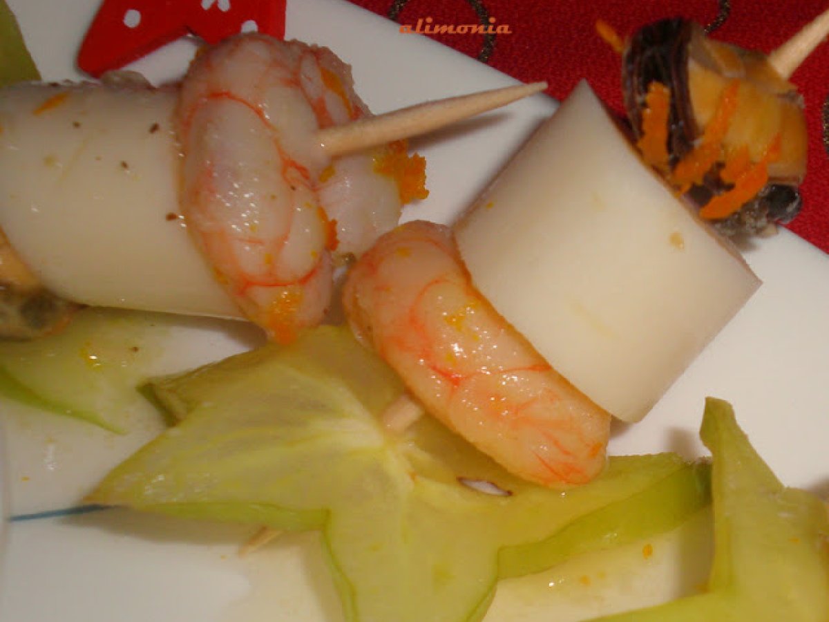 Cojer un palito y entrar un mejillone, un palmito, una gambas, cerrar con una estrella. - Guardar en el plato de presentacion y seguir con los demas.