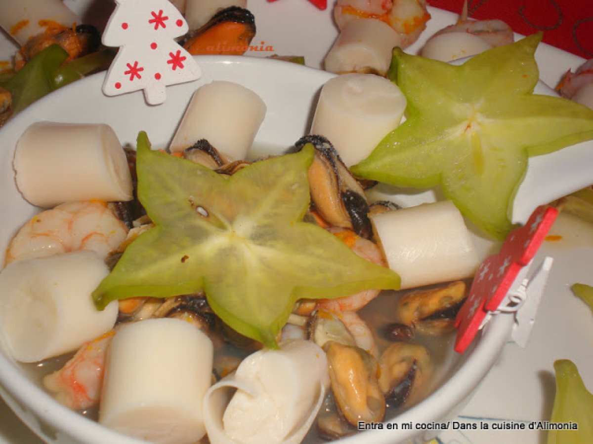 - En un cazon, poner los mejillones congelados y las gambas peladas congeladas, el vaso de vino blanco, el zumo de naranja y la piel rallada de la naranja, salpimentar.