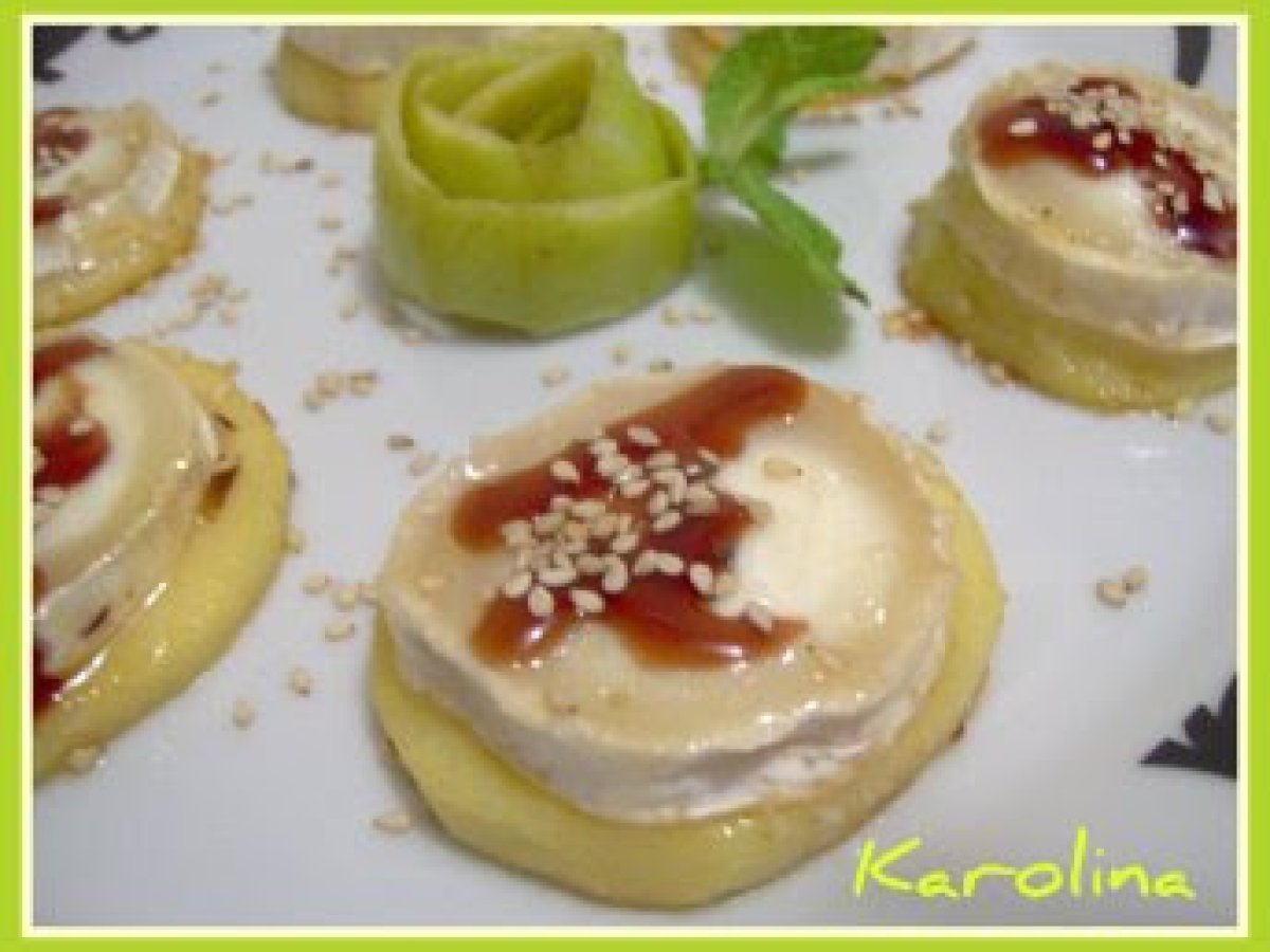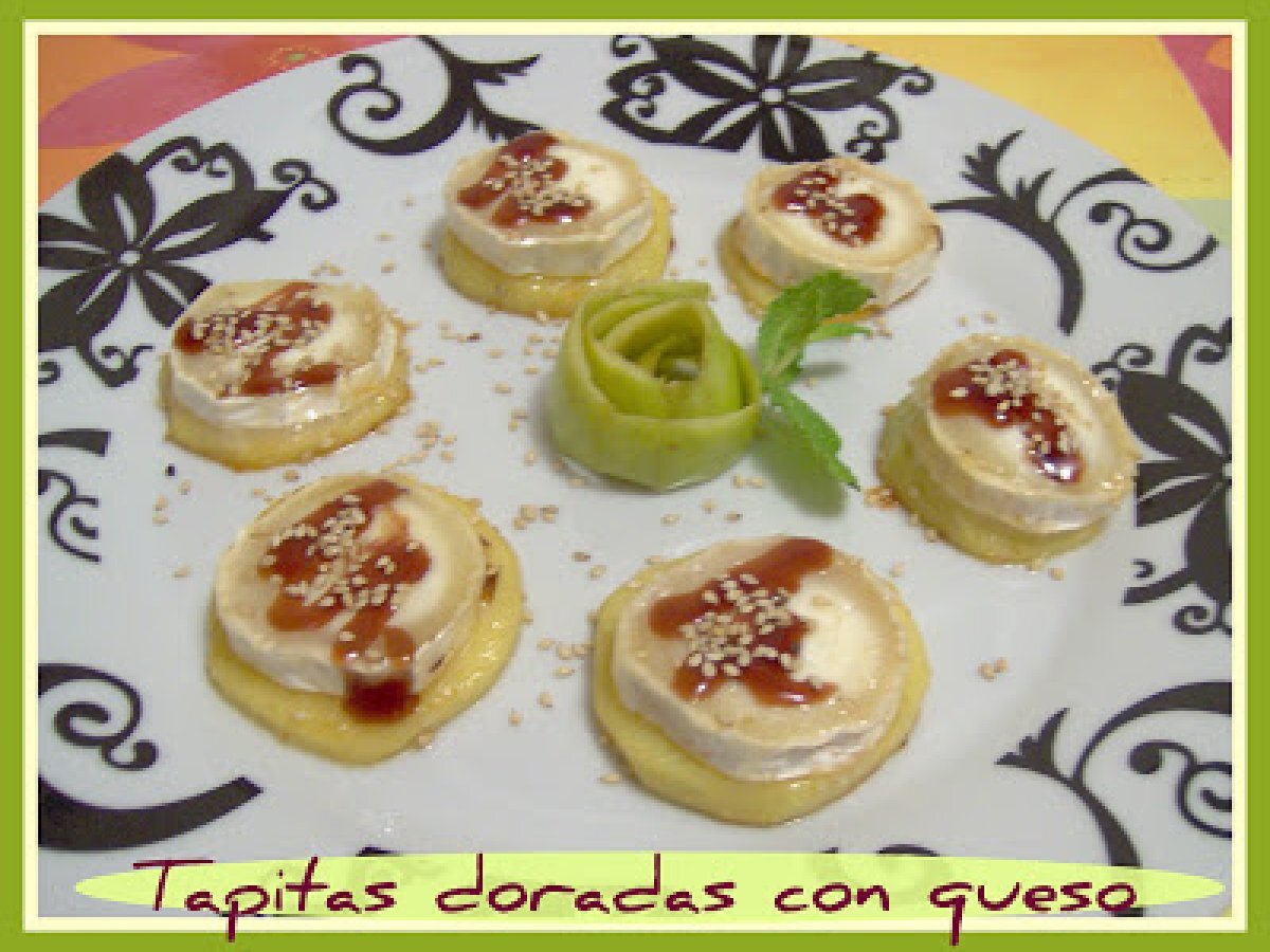 Tapitas doradas con queso AnteriorSiguiente AperitivoFácil30 min160 Kcal Enviar esta receta a un amigo Imprimir esta página Preguntar al autor Publicar la foto de esta receta Un ingreso simplemente espléndido Ingredientes 3 6 rueditas de queso de cabra 1 manzana pequeña 1 nuez de mantequilla crema de modena a la frambuesa sesamo medio limon Costo estimado: 2.58Euros€ (0.86€/porción)
