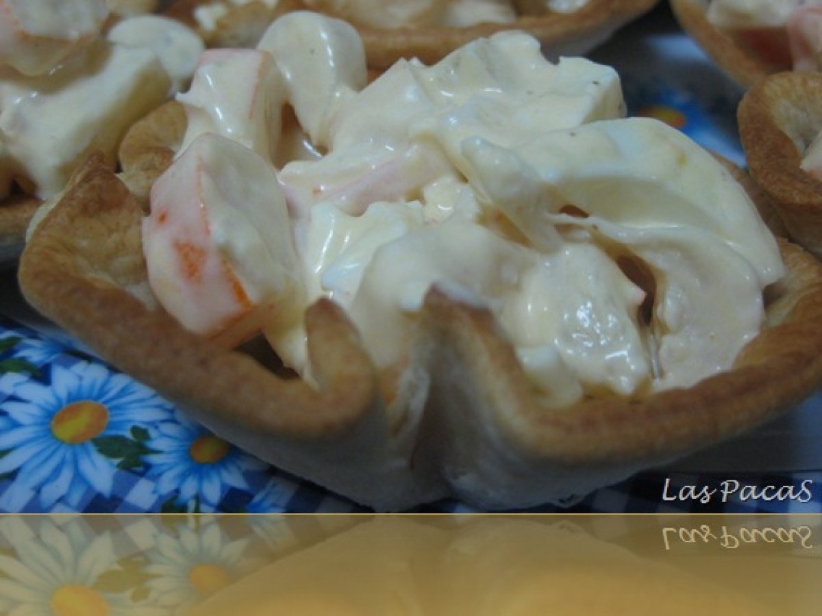 Tartaletas de ensalada de palmitos AnteriorSiguiente AperitivoMedio45 min Enviar esta receta a un amigo Imprimir esta página Preguntar al autor Publicar la foto de esta receta Ingredientes 8 1 paquete de tartaletas 1 lata de palmitos 6 palitos de cangrejo Piña en almíbar Mayonesa 2 huevos cocidos