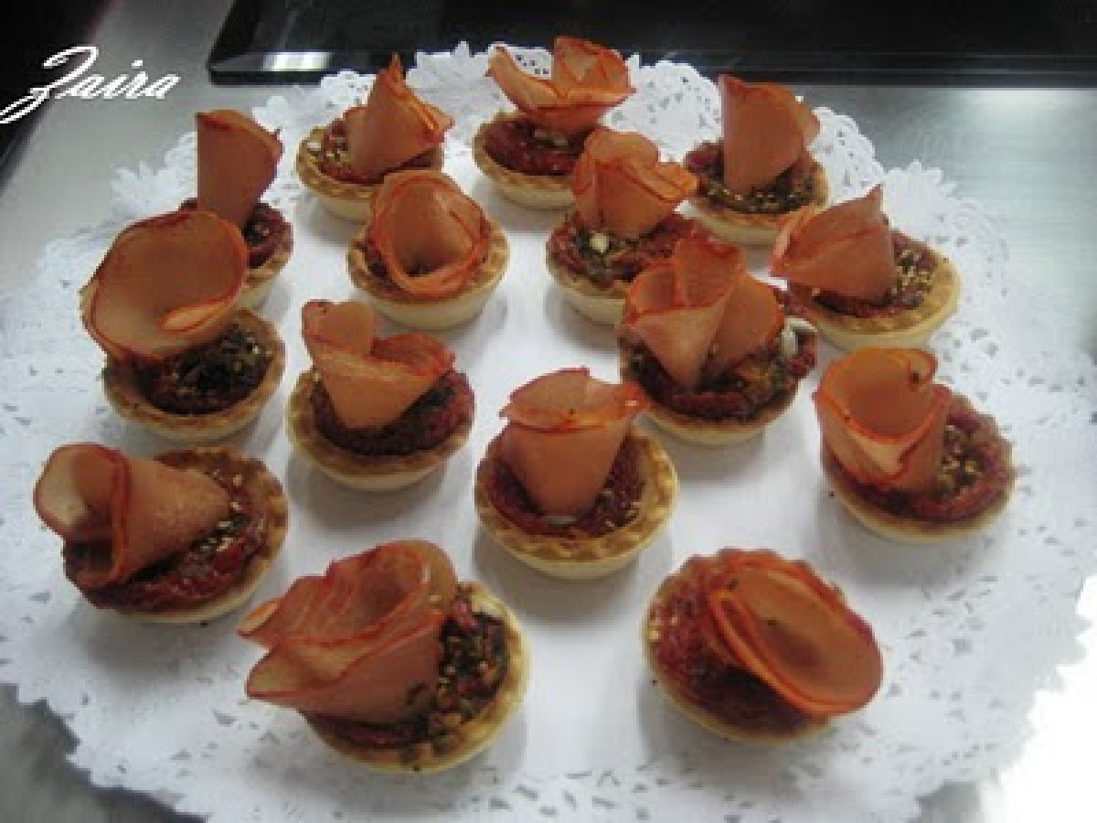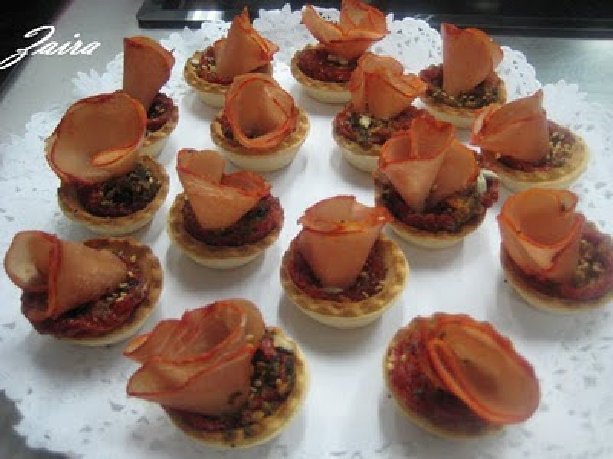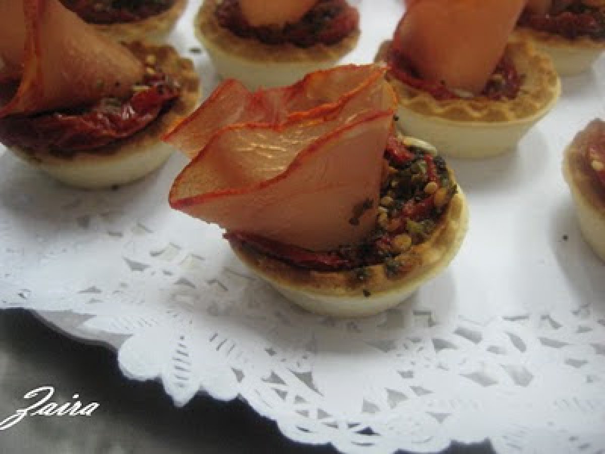Tartaletas de lomo embuchado y tomates secos marinados AnteriorSiguiente AperitivoFácil35 min Enviar esta receta a un amigo Imprimir esta página Preguntar al autor Publicar la foto de esta receta Ingredientes 6 18-24 tartaletas 18-24 lonchas de lomo embuchado 18-24 tomates secos previamente marinados un poco de cebollino picado semillas tostadas, algún fruto seco tostado u otro detalle para adornar