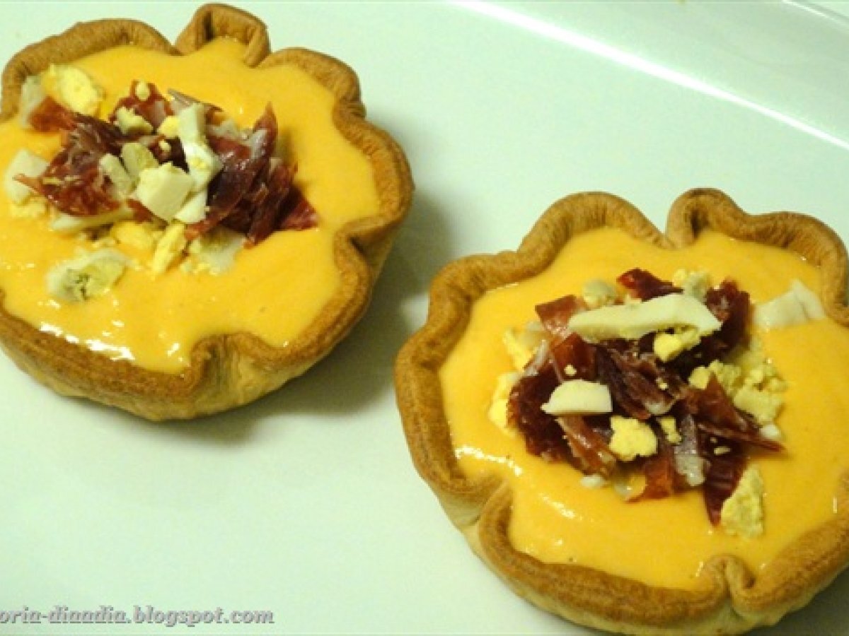 Tartaletas de salmorejo vota ahora AperitivoFácil25 min Enviar esta receta a un amigo Imprimir esta página Preguntar al autor Publicar la foto de esta receta Ingredientes 2 1 paquete de tartaletas "La Cocinera" 500 g de tomates maduros 100 g de pan duro, con un par de días 100 ml de aceite de oliva virgen extra (de sabor suave) 1 diente de ajo sal jamón picado (para adornar) huevo cocido (para adornar)