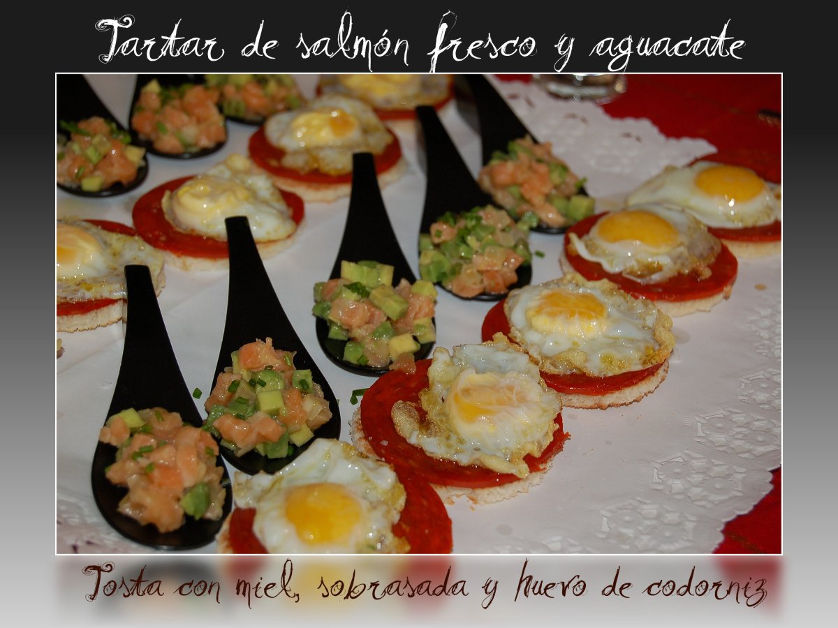 Tartar de salmón fresco y aguacate - tostas con miel, sobrasada y huevos de codorniz AperitivoMedio1 h 10 m303 Kcal Enviar esta receta a un amigo Imprimir esta página Preguntar al autor Publicar la foto de esta receta Ingredientes 8 200 g de salmón fresco 1 aguacate 1 cebolleta pequeña salsa perrins tabasco ralladura de limón y el zumo. cebollino aceite de oliva sal y pimienta Pan de molde troquelado redondo Miel Sobrasada 1 huevo de codorniz por tostada sal maldon Costo estimado: 8.39Euros€ (1.05€/porción)