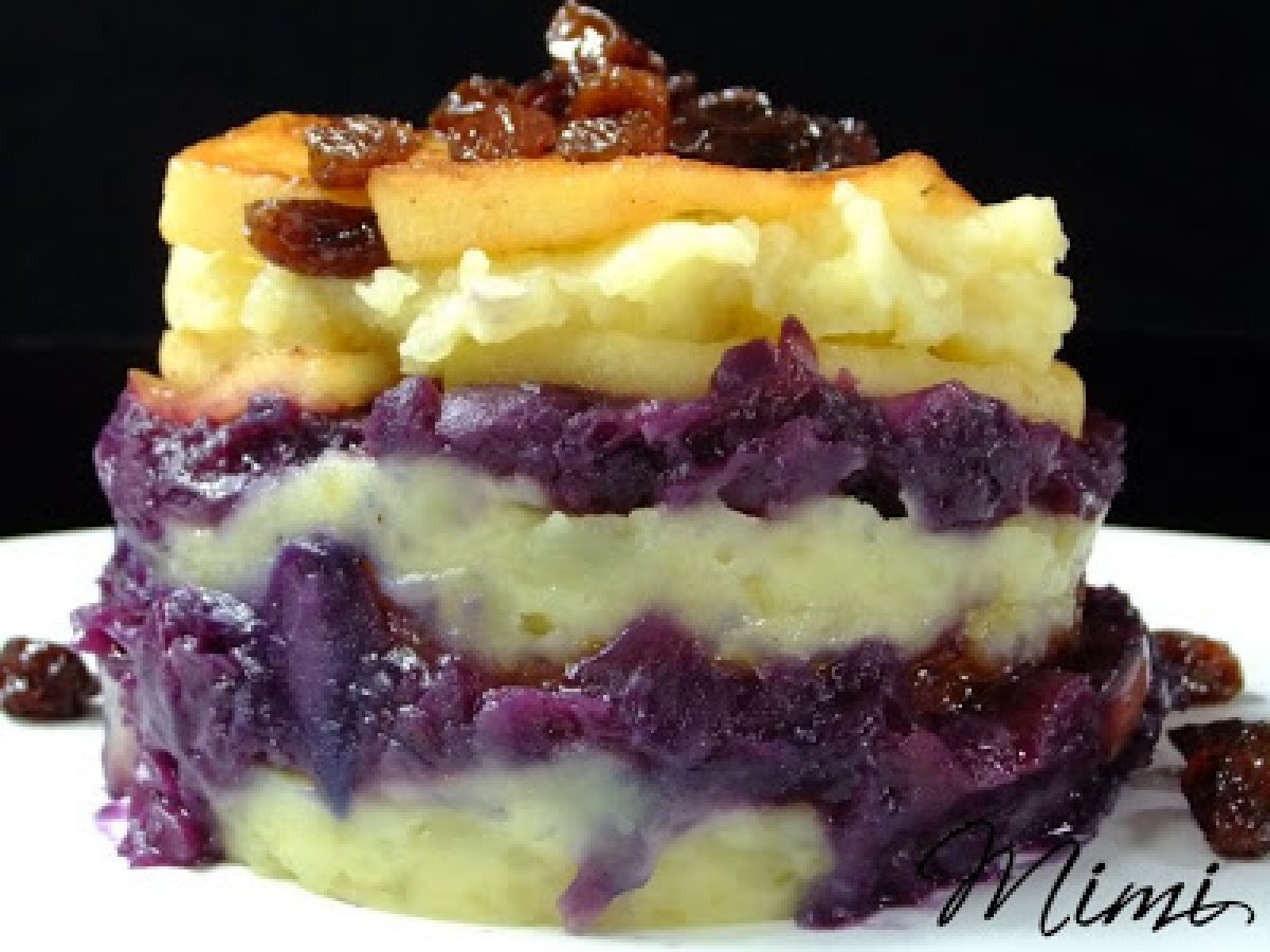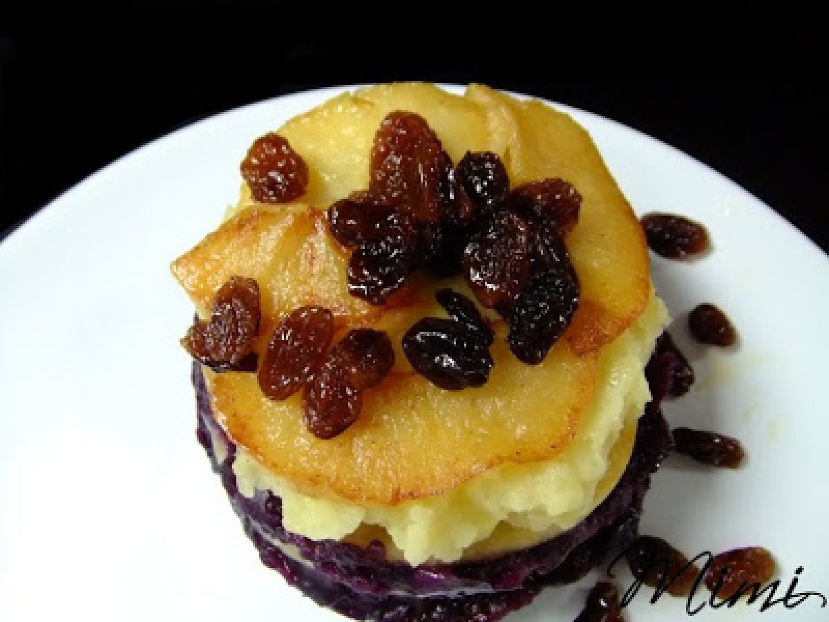 Tartita de col lombarda, manzanas, patatas y pasas AnteriorSiguiente AperitivoFácil2 h 20 m Enviar esta receta a un amigo Imprimir esta página Preguntar al autor Publicar la foto de esta receta Ingredientes 4 100 g de mantequilla 1 cebolla cortada en aritos 600 g de col lombarda cortada en juliana 2 clavos ( de especias ) sal pimienta recién molida 2 cucharadas de azúcar ( mejor de caña ) 750 g de patatas ( peladas y cortadas en daditos ) 250 ml de leche nuez moscada 2 manzanas ( peladas y cortadas en rodajas ) 1 cucharada de azúcar una pizca de canela 50 g de uvas pasas 1 vasito de vino dulce de Jerez.