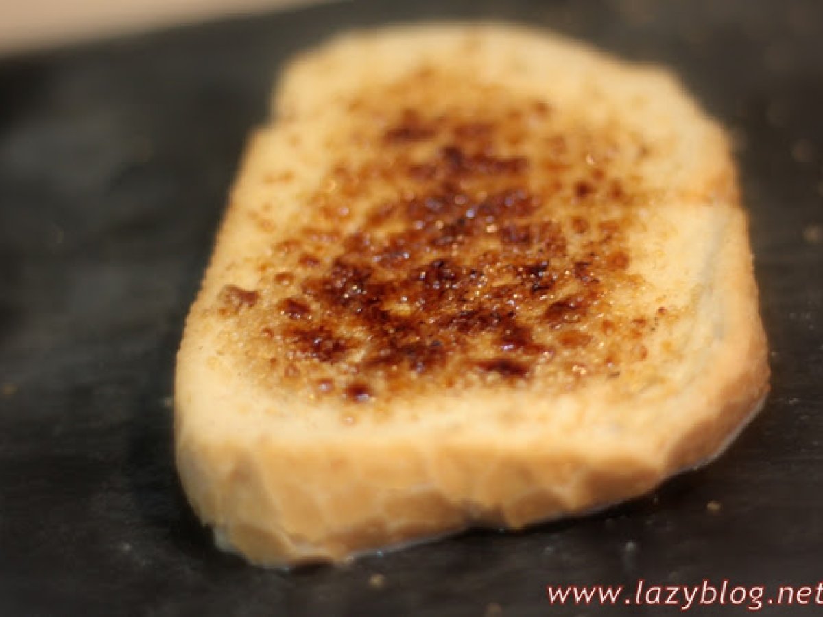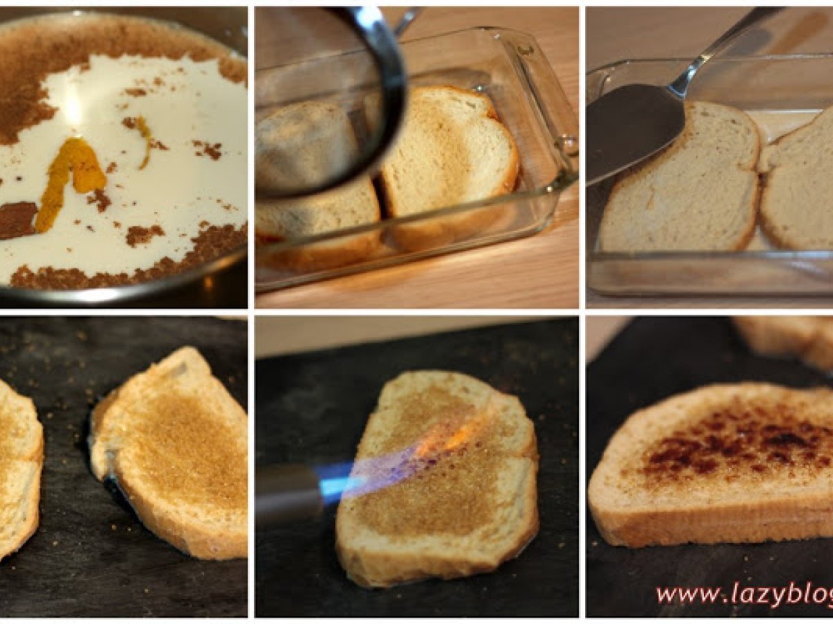 Torrijas caramelizadas, sin freír y sin huevo AnteriorSiguiente AperitivoFácil40 min329 Kcal Enviar esta receta a un amigo Imprimir esta página Preguntar al autor Publicar la foto de esta receta Ingredientes 4 8 rebanadas de pan de torrijas o de pan del día anterior, 250 ml. de leche entera, 100 g de azúcar, 1 cáscara de naranja, 1 rama de canela, azúcar moreno para quemar. Costo estimado: 4.96Euros€ (1.24€/porción)