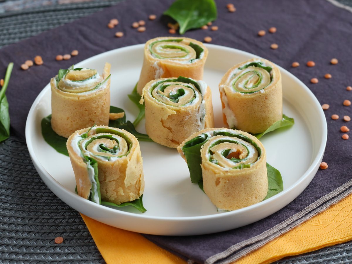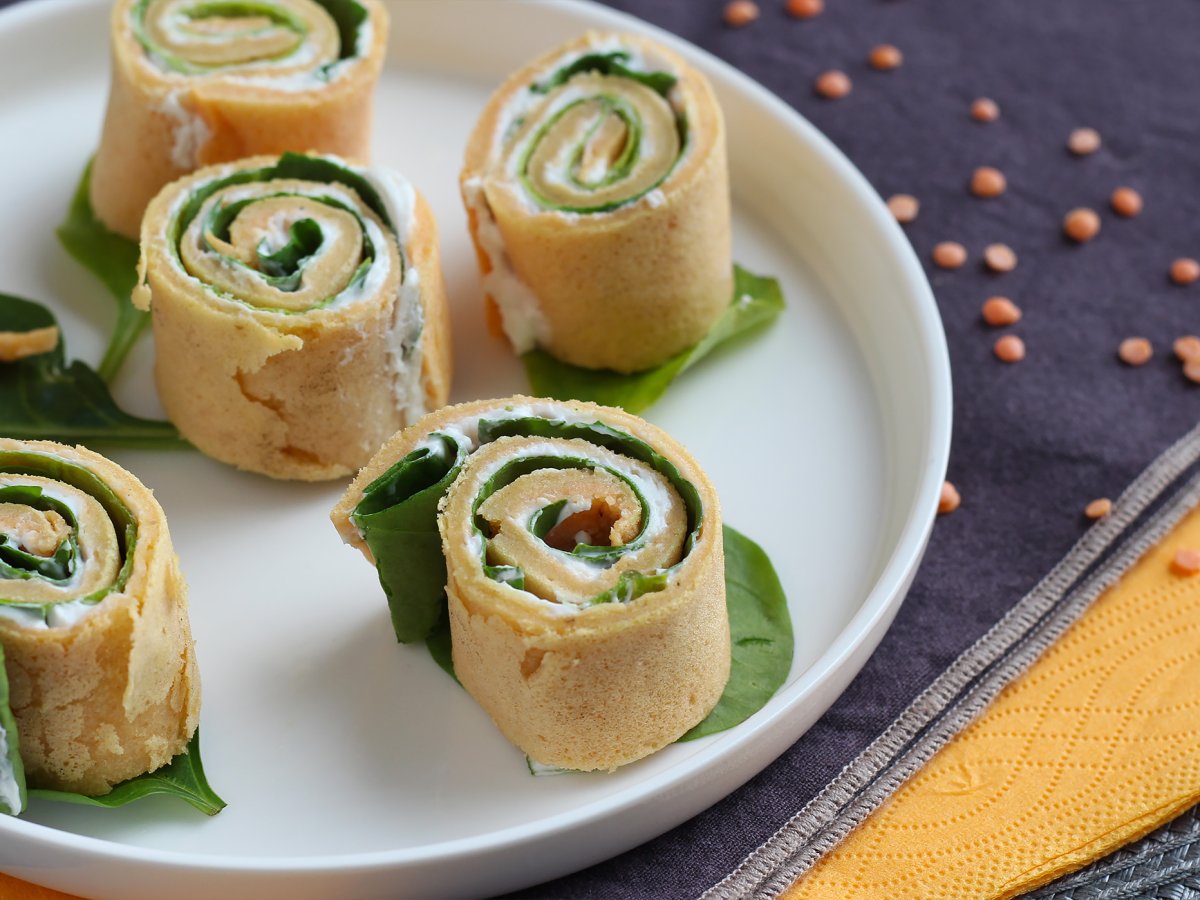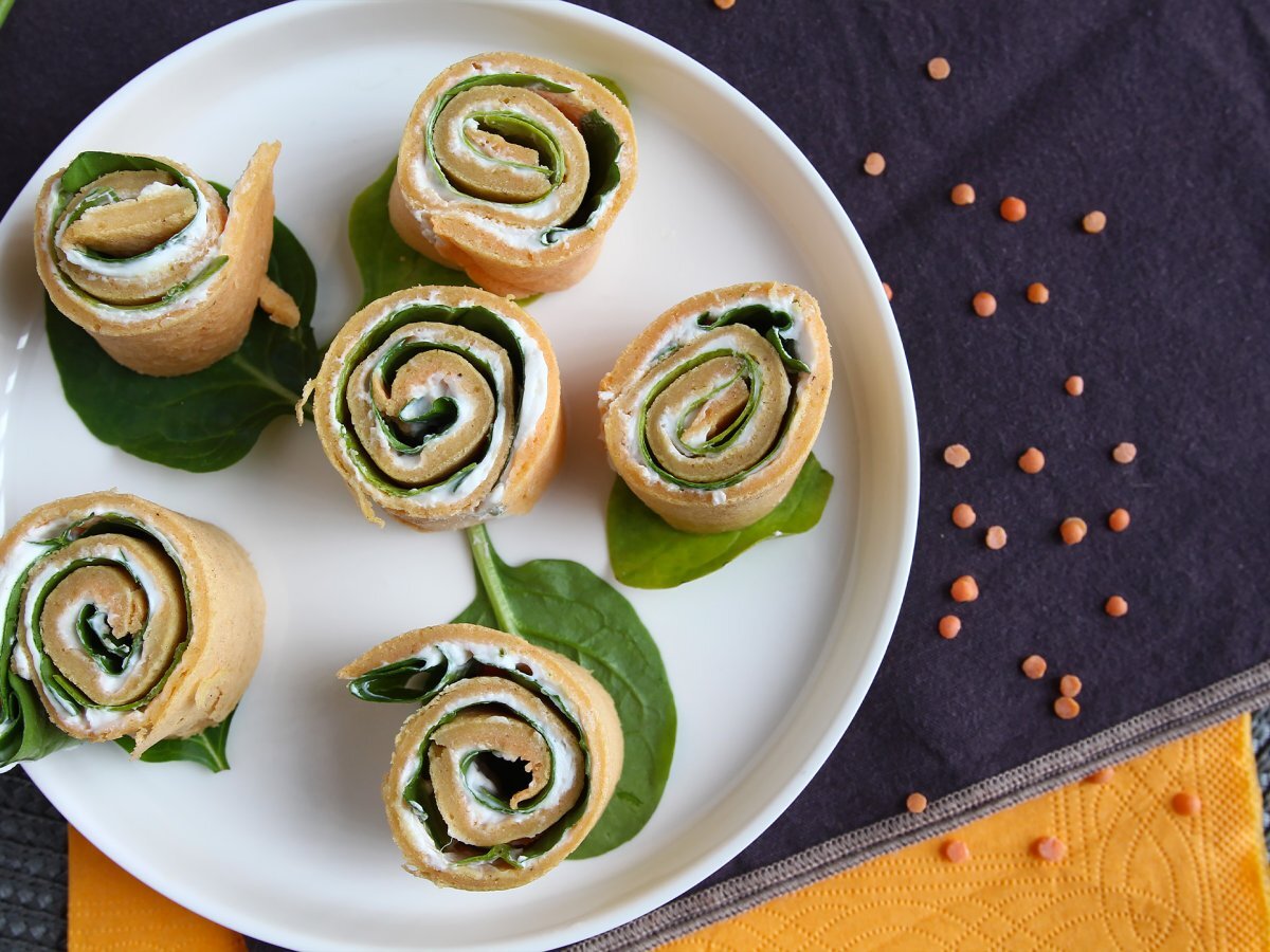 Extender 1 capa de queso crema por toda la base de la tortita de lentejas. Sobre el queso añade el jamón cocido picado en pequeñas tiras. Por último, lavar, escurrir, cortar las hojas de espinacas y añadirlas sobre el jamón cocido. - Enrollar la tortita. Cortar en pequeños trozos y servir.